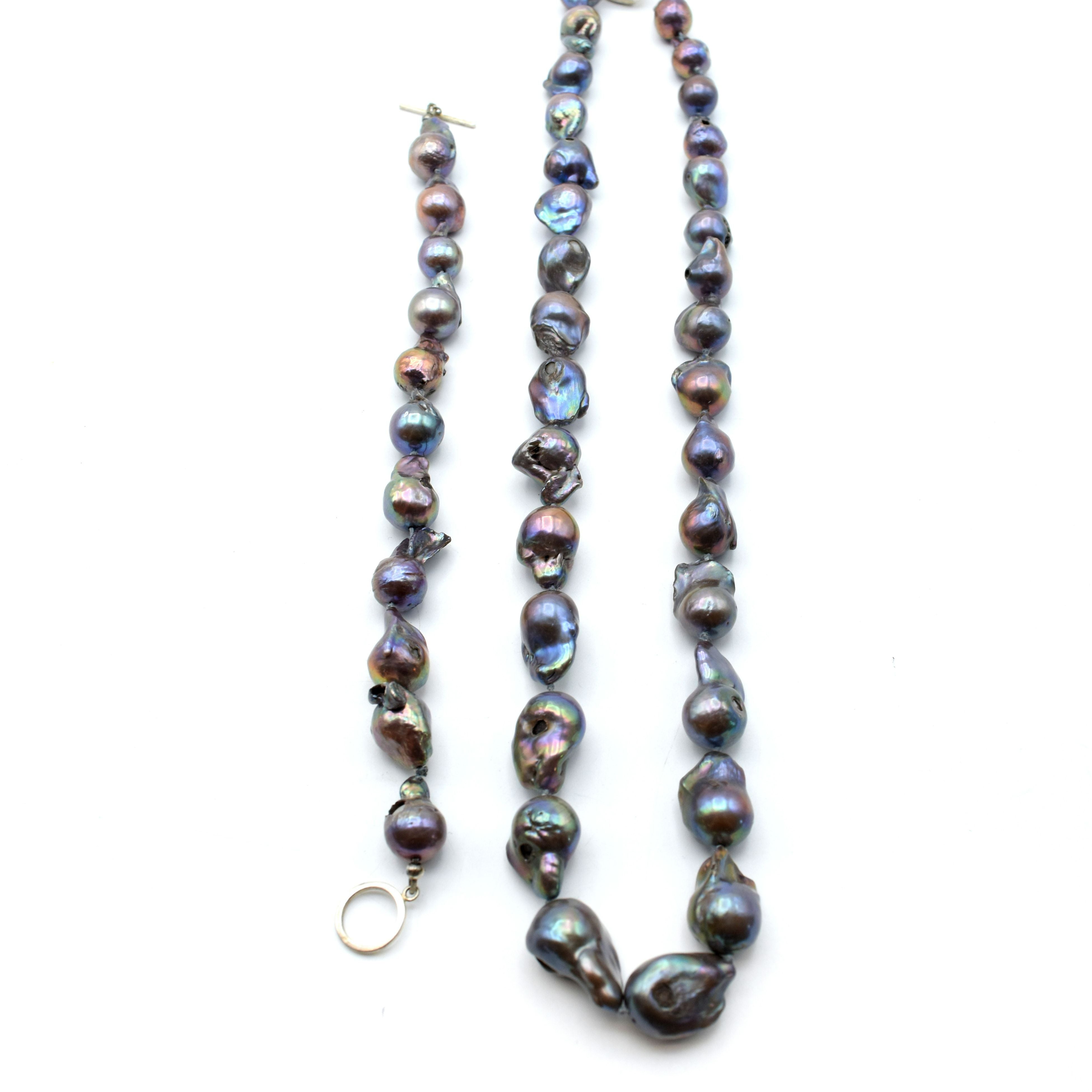 Halssnoer en armband van barokparels met sluitingen in zilver (gedeelten in metaal) (59 & 21.5 cm)