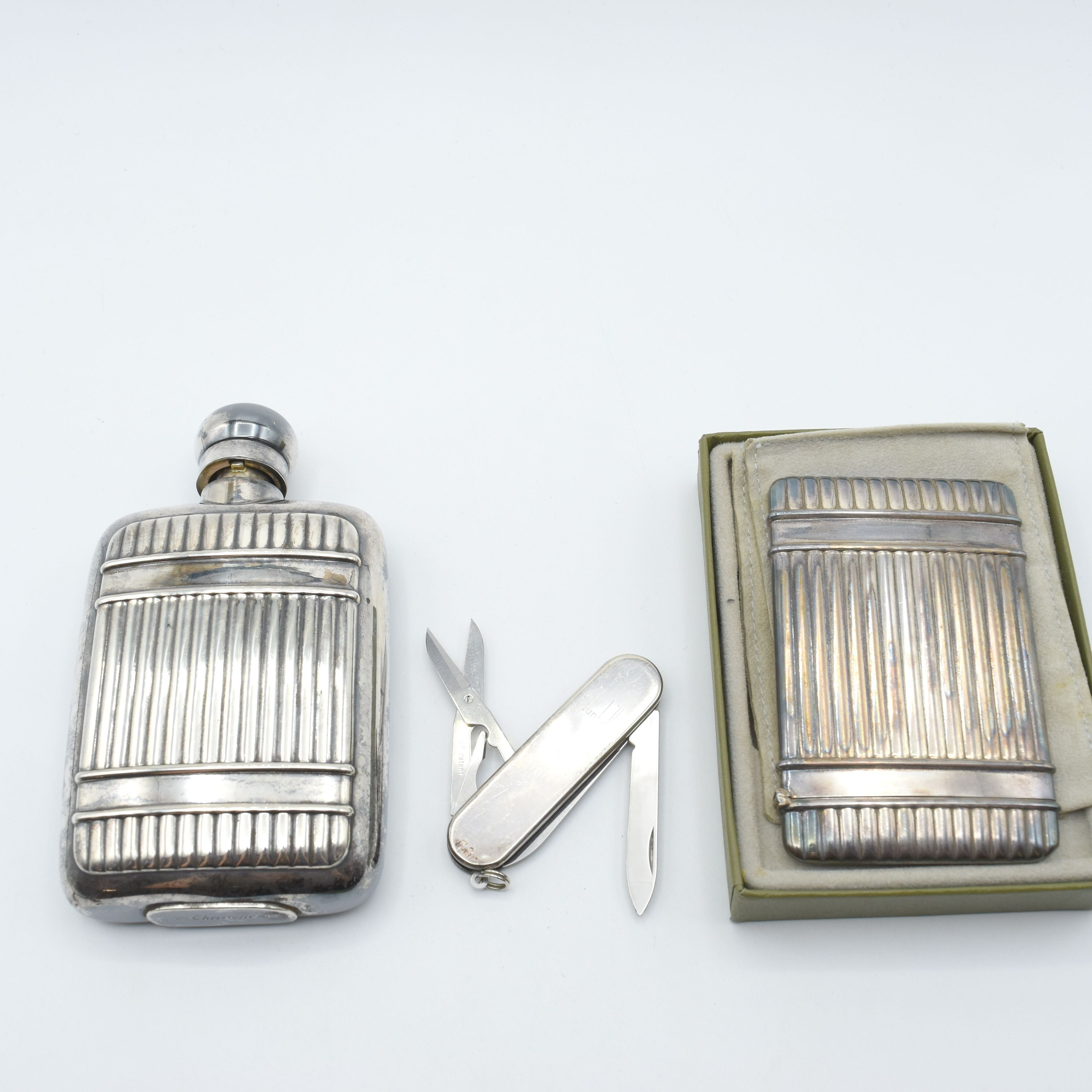 Zwitsers mes in zilver 925/1000 getekend DUNHILL 1 notablok in verzilverd metaal, 1 sigarendoosje, 1 alcoholflesje en 1 luciferdoosje in verzilverd metaal getekend CHRISTOFLE + originele doosjes