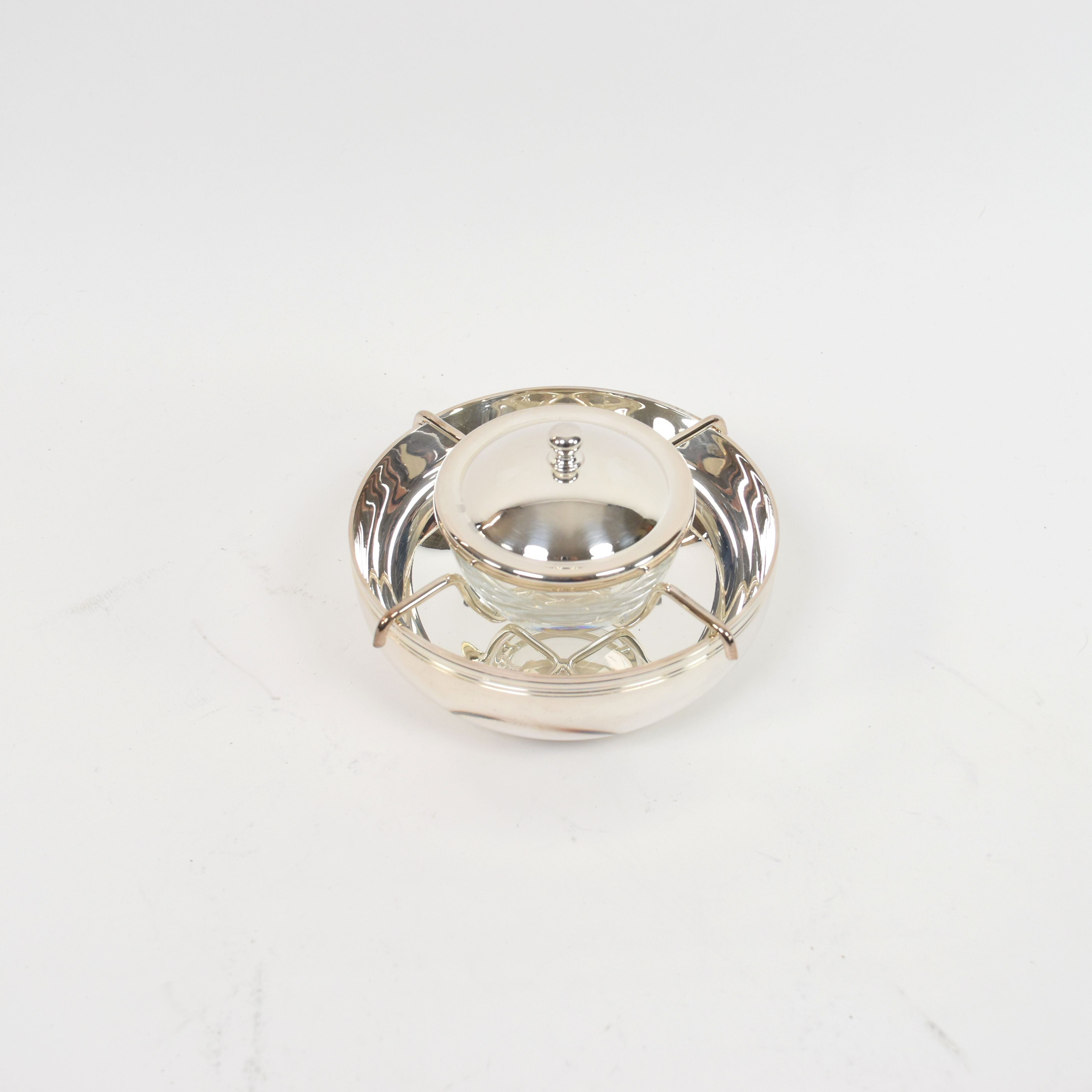 Kaviaarschaal in verzilverd metaal getekend CHRISTOFLE met gedeelte in glas + originele doos (brandsporen) (Diam: 15 cm)