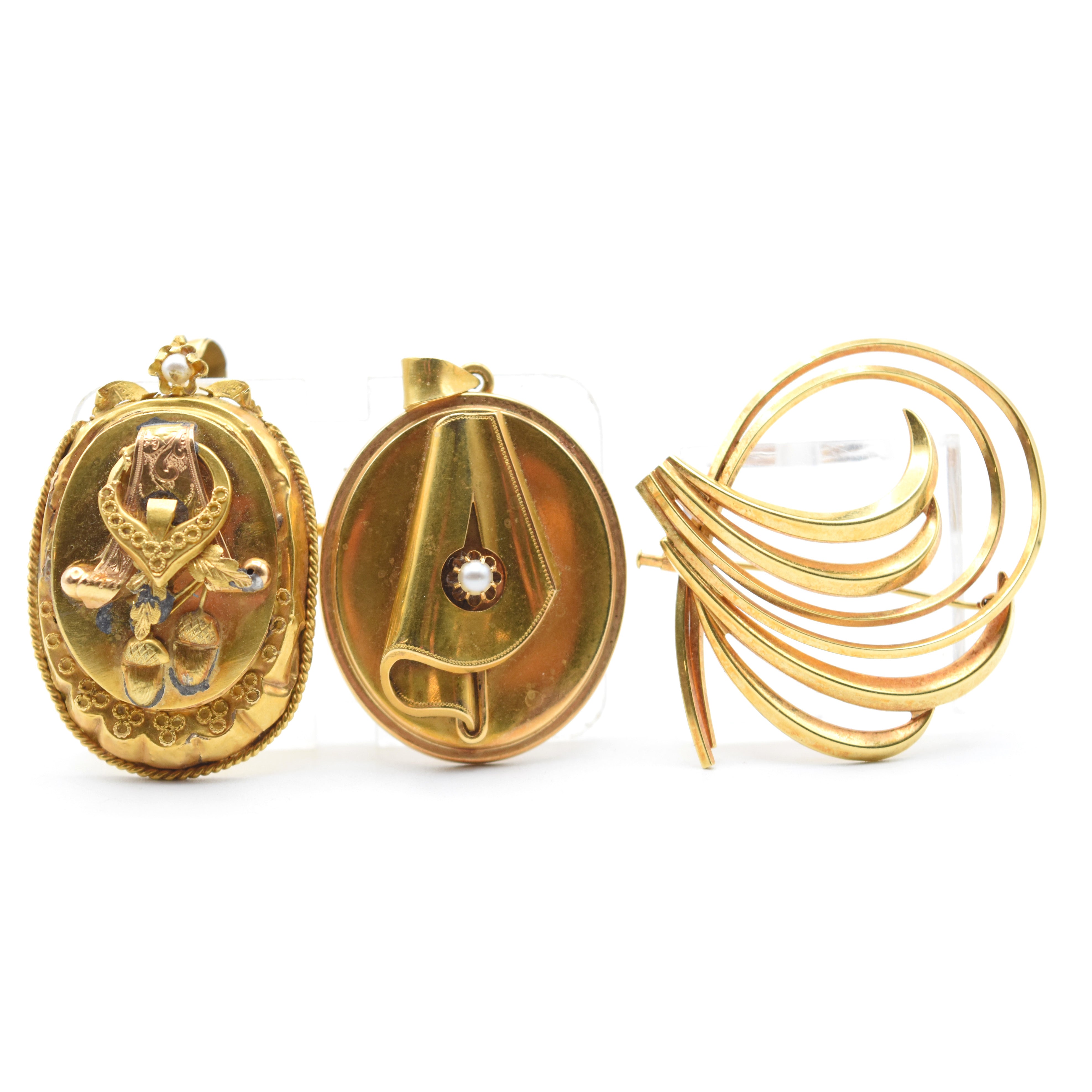 Hanger, borstspeld en hanger/borstspeld in 18 kt geel- en witgoud (parels, textiel, gedeelte ontbreekt, beschadigd, gedeukt, lasnaad) - 37.1 gr bruto