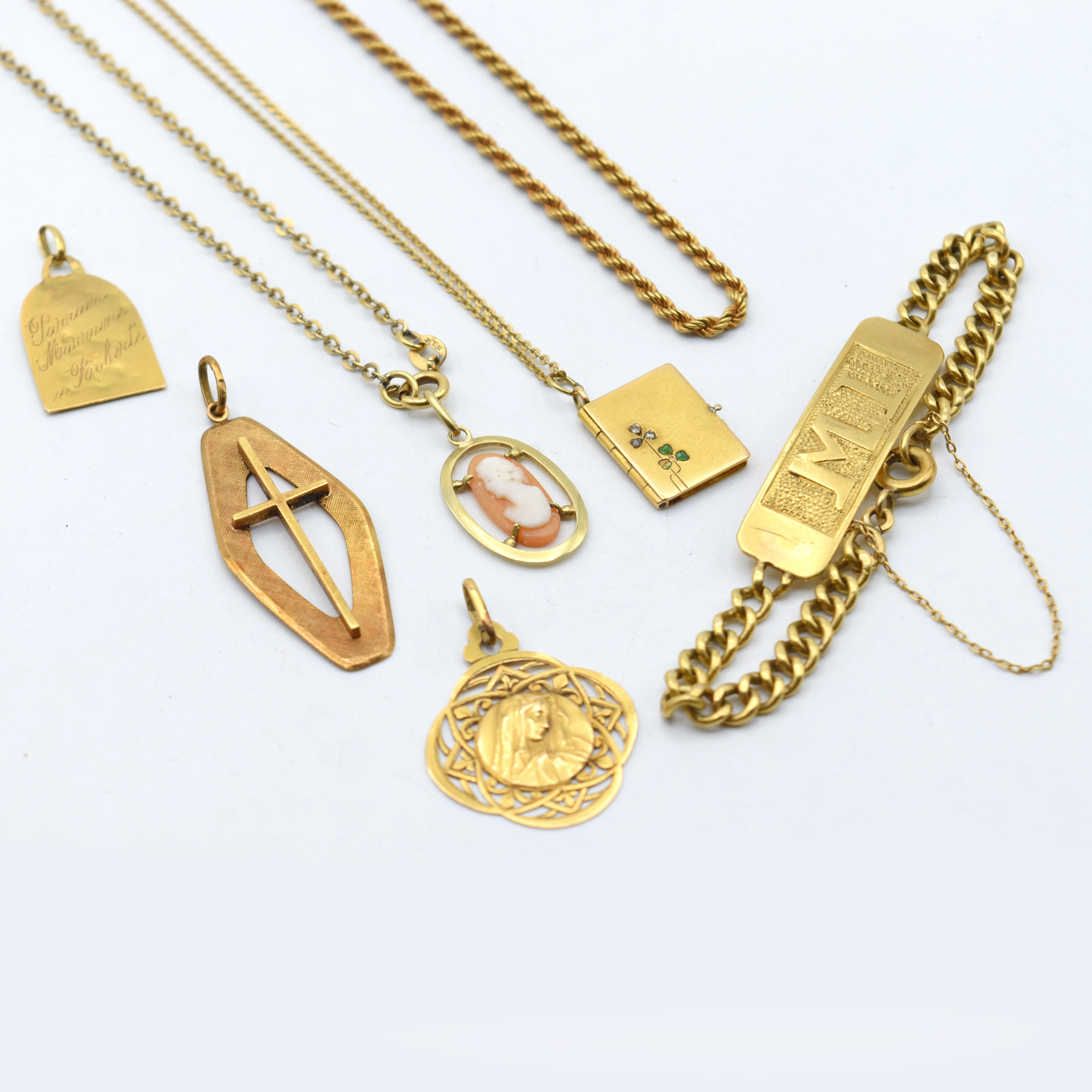 3 halskettingen, kruis, 4 hangers en schakelarmband in 18 kt geelgoud bezet met 3 diamantscherfjes (camee, email, email beschadigd, gepersonaliseerd, veiligheidsketting, beschadigd, gedeukt) - 43 gr bruto (Maten: +/- 50.5, 51 & 52) (17 cm)