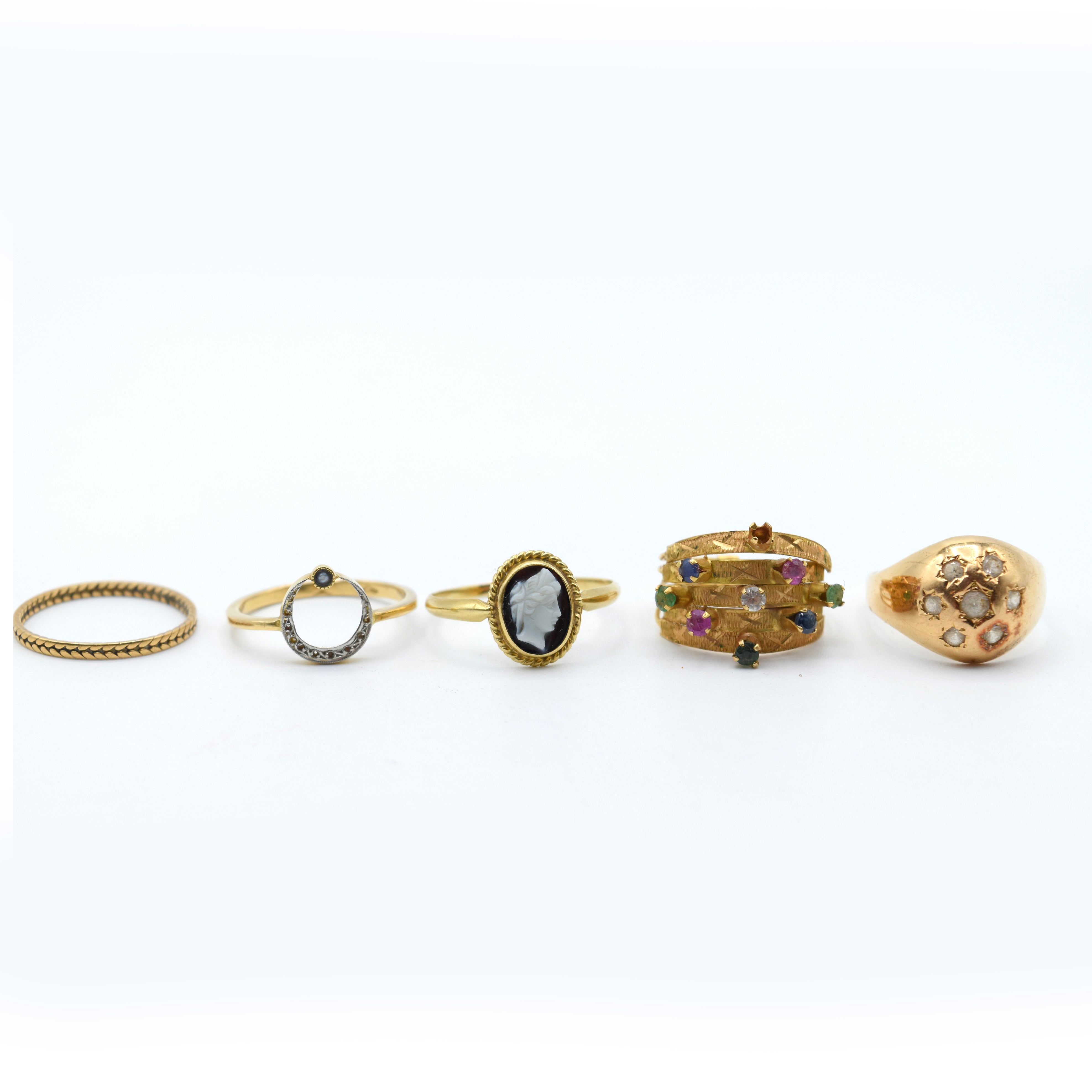 5 ringen in 18 kt geelgoud met gedeelte in platina bezet met diamantscherfjes (valse stenen, kleurstenen, parel, camee, steen ontbreekt, beschadigd, gedeukt) - 14.4 gr bruto (Maten: 52, 56, 57, 59 & 63)