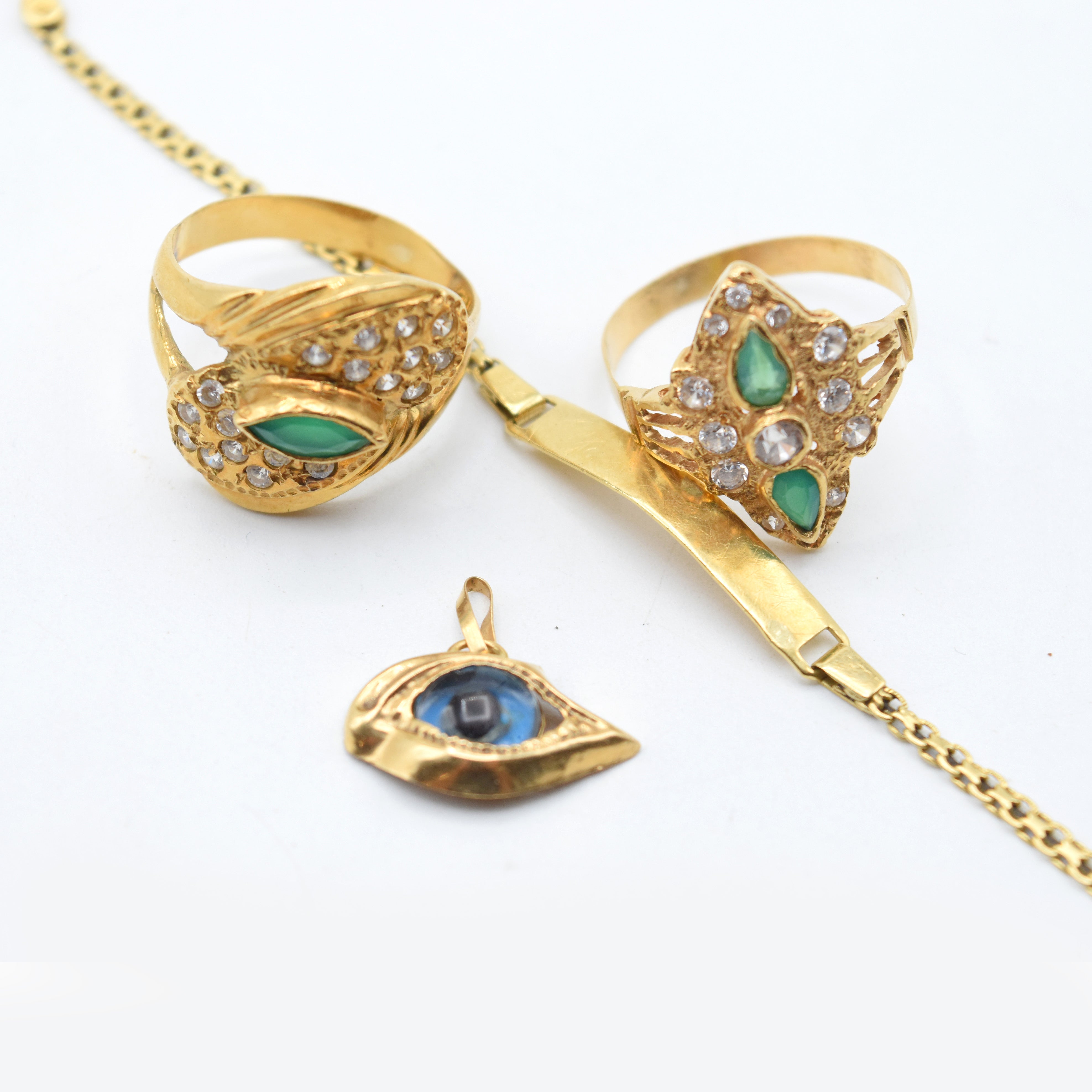 2 ringen, hanger en schakelarmband in 18 kt geelgoud (valse stenen, kleurstenen, stuk ontbreekt, gedeukt, gebroken) - 12.1 gr bruto (Maten: 60 & 61) (14.5 cm)