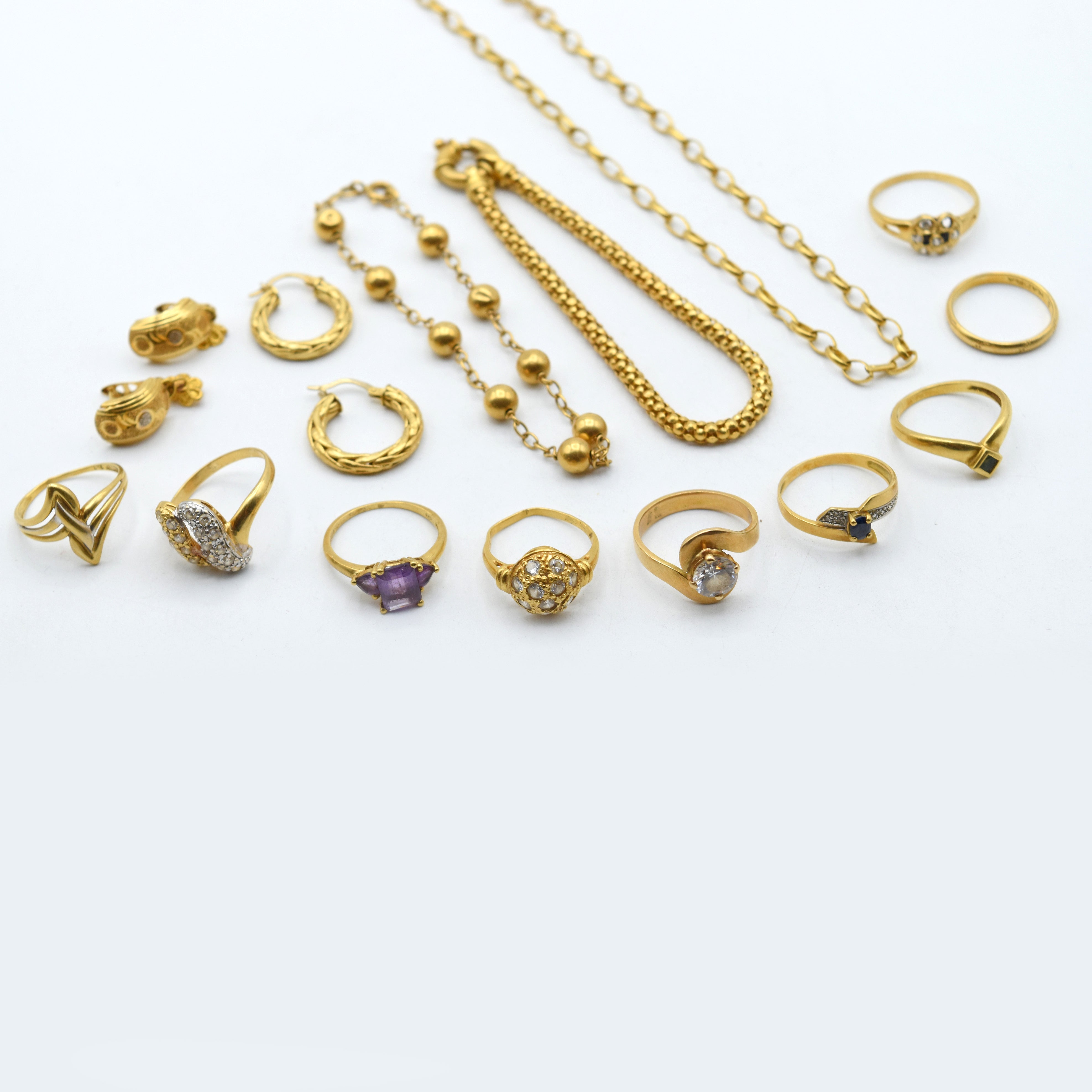Trouwring, 8 ringen, halsketting, 2 armbanden en 4 oorringen in 18 kt geel- en witgoud bezet met 3 diamanten 8/8 slijpsel +/- 0.01 kt (valse stenen, kleurstenen, steen ontbreekt, email, gepersonaliseerd, beschadigd, gedeukt, gebroken) - 43.1 gr bruto (Maten: 51, 52, 53 x 3, 54, 54.5, 55 & 56) (43 & 19 x 2 cm)