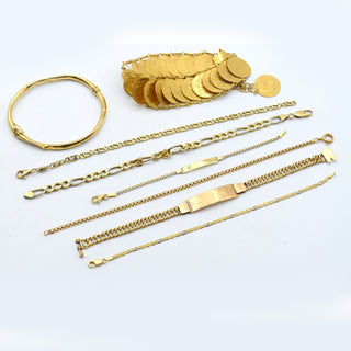 5 armbanden waarvan 1 met vastgehechte hanger, onbuigzame armband en 2 schakelarmbanden in 18 kt geel- en witgoud (veiligheidsketting, gepersonaliseerd, beschadigd, gedeukt) - 89.1 gr (21 x 3, 20, 18 x 2 et 14.5 cm) (6.2 x 5.4 cm)