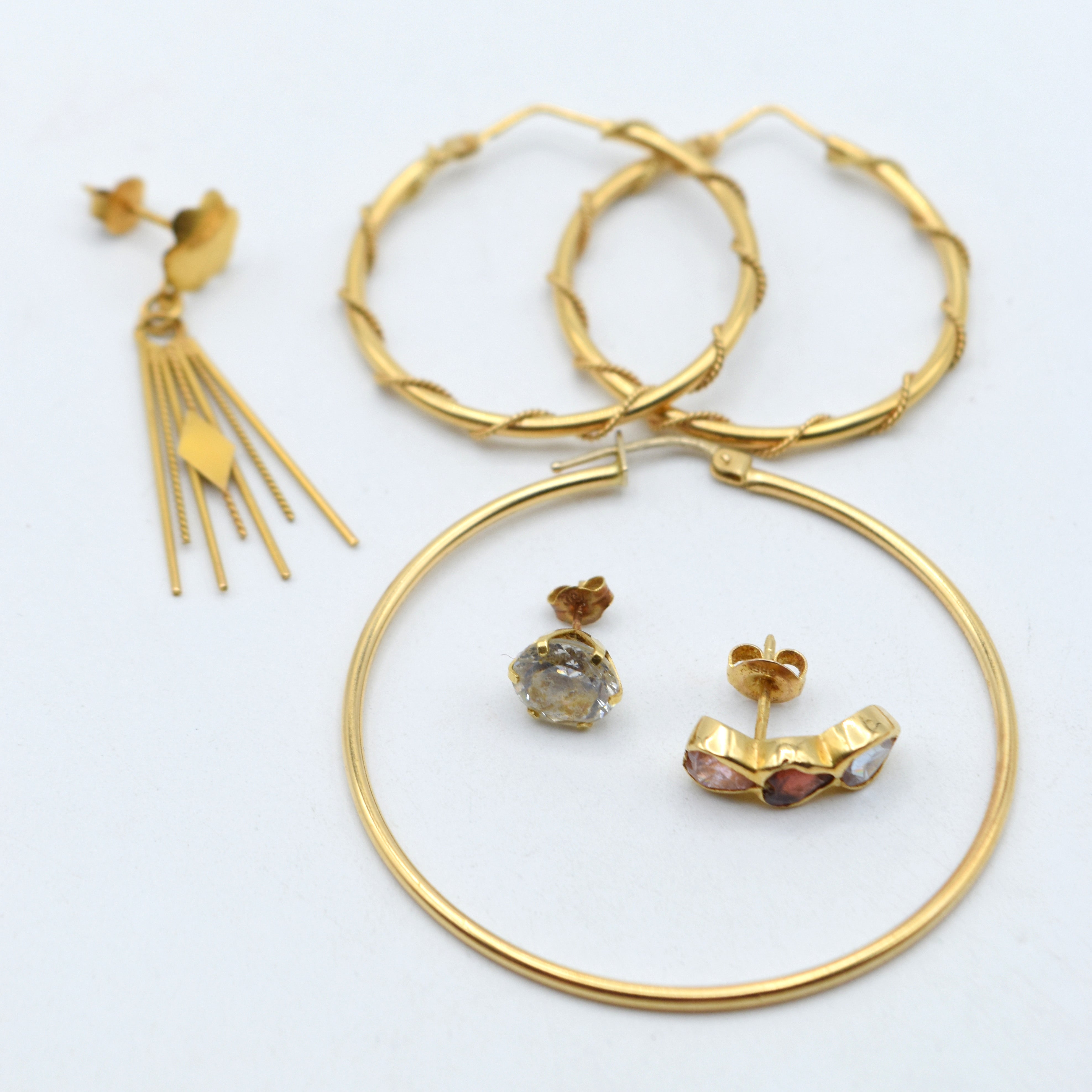 6 niet samenhorende oorringen in 18 kt geelgoud (valse stenen, kleurstenen, 1 drukknoop in metaal, gedeukt) 11.5 gr bruto
