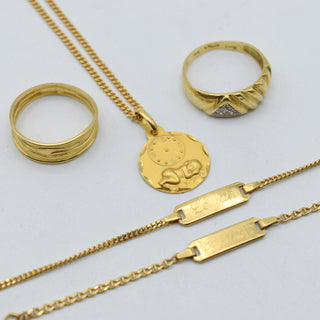 2 ringen, halsketting, hanger en 2 schakelarmbanden in geelgoud 18 kt (valse stenen, gepersonaliseerd, beschadigd, gedeukt) - 13.3 gr bruto (Maten: 53 & 54.5) (40 & 14 x 2 cm)