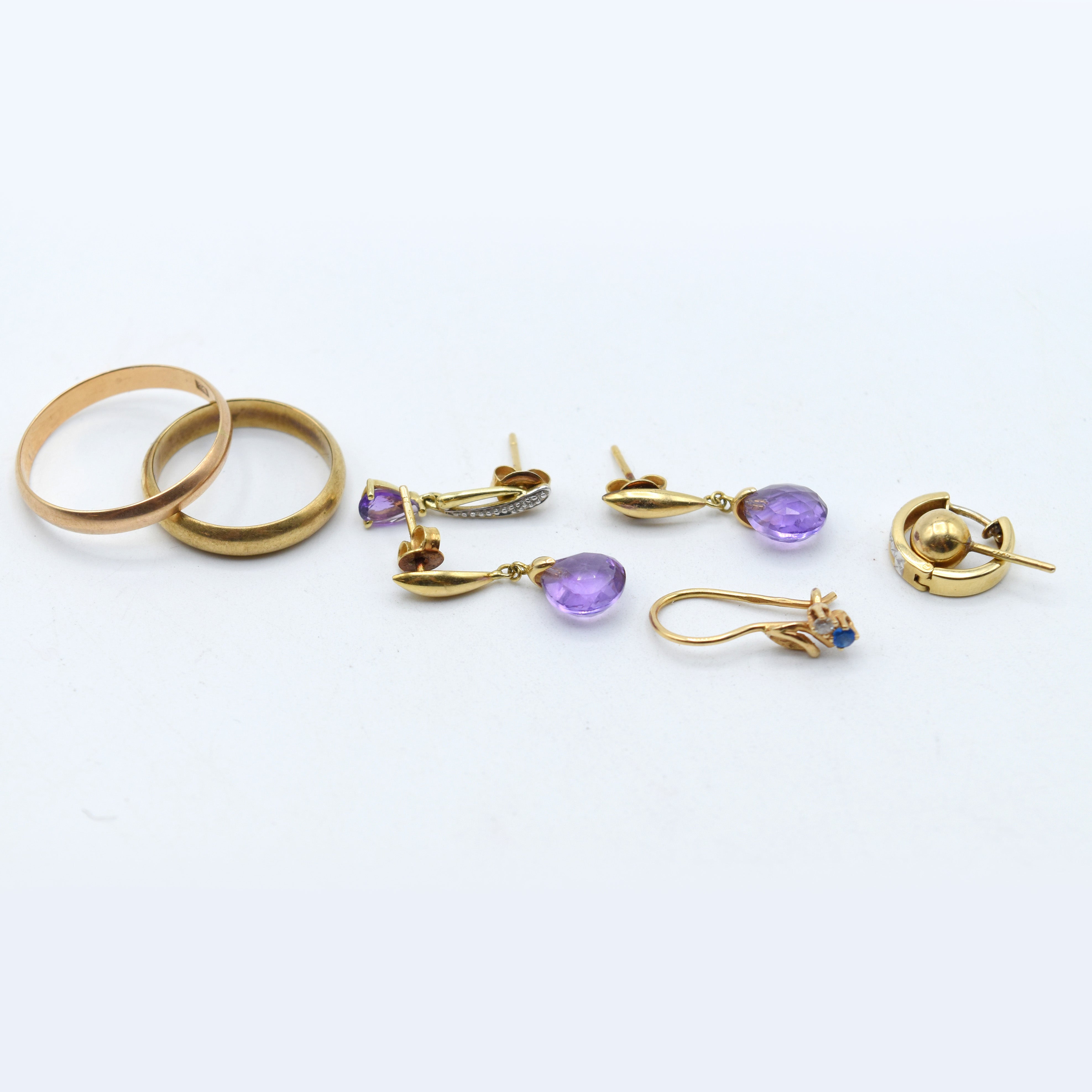 2 trouwringen en 6 niet-samenhorende oorringen in 14 kt 3-kleurengoud (valse stenen, kleurstenen, drukknoop ontbreekt) - 9.7 gr bruto (Maten: 63 & 54)