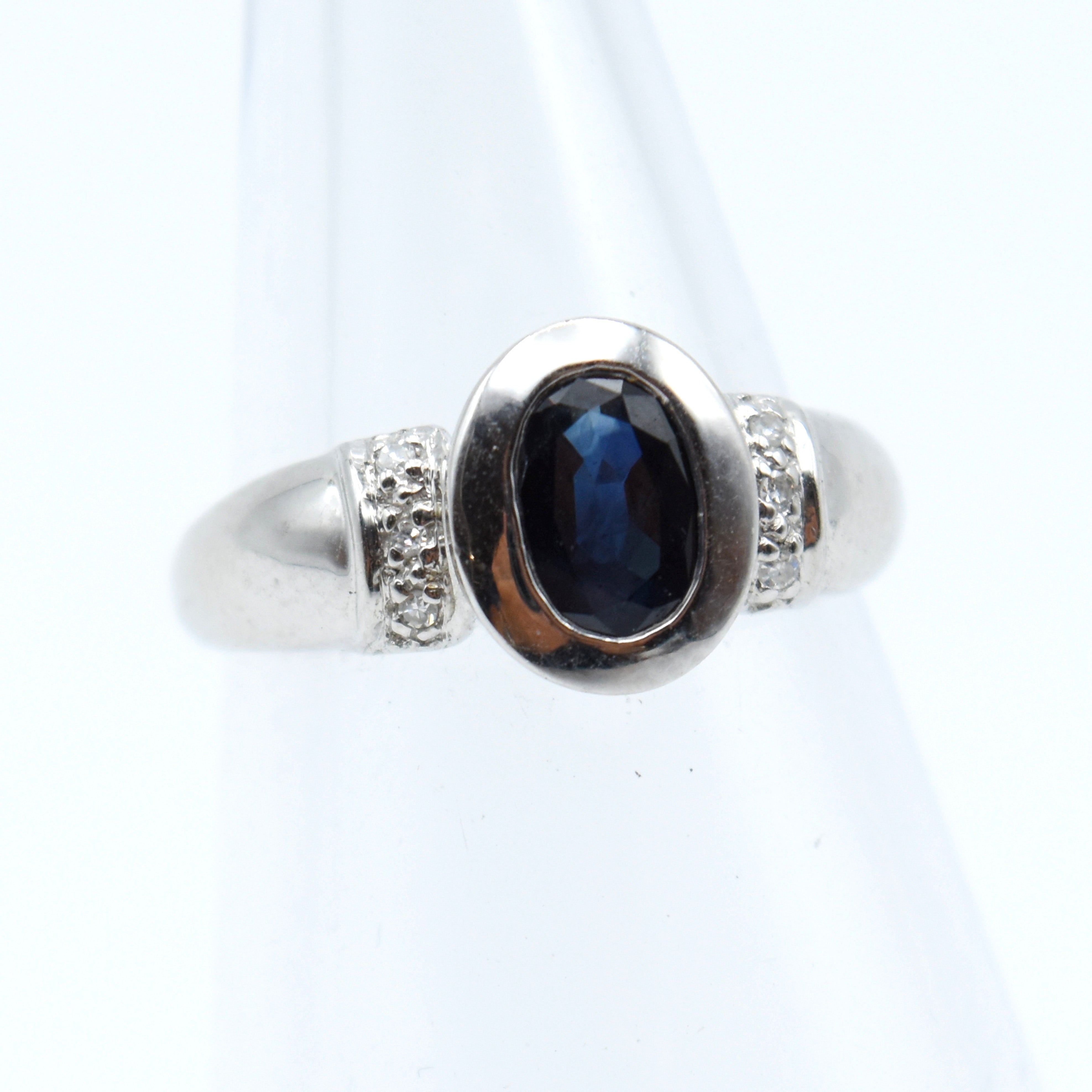 Ring in 18 kt witgoud bezet met 6 diamanten 8/8 slijpsel +/- 0.06 kt (kleursteen) - 3.8 g (Maat: 54)