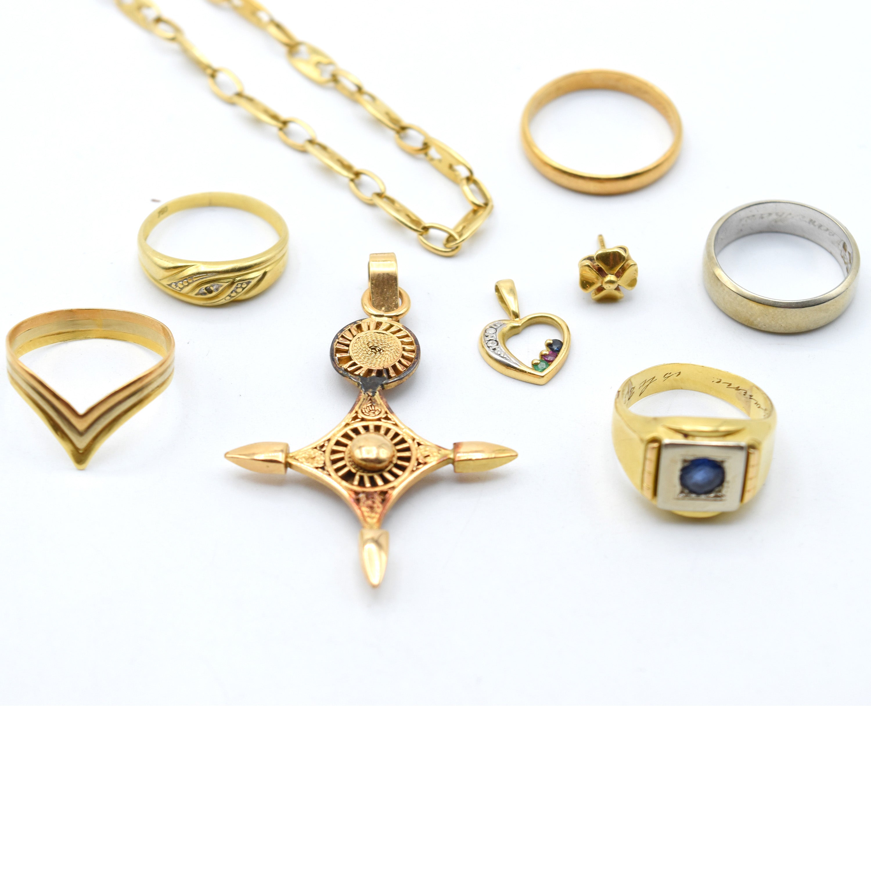 2 trouwringen, 3 ringen, 2 hangers, armband en 1 oorring in 18 kt 3-kleurengoud (valse stenen, kleurstenen, gegraveerd) - 29.5 gr bruto (Maten: 59, 56, 51, 50.5 & 50) (18 cm)