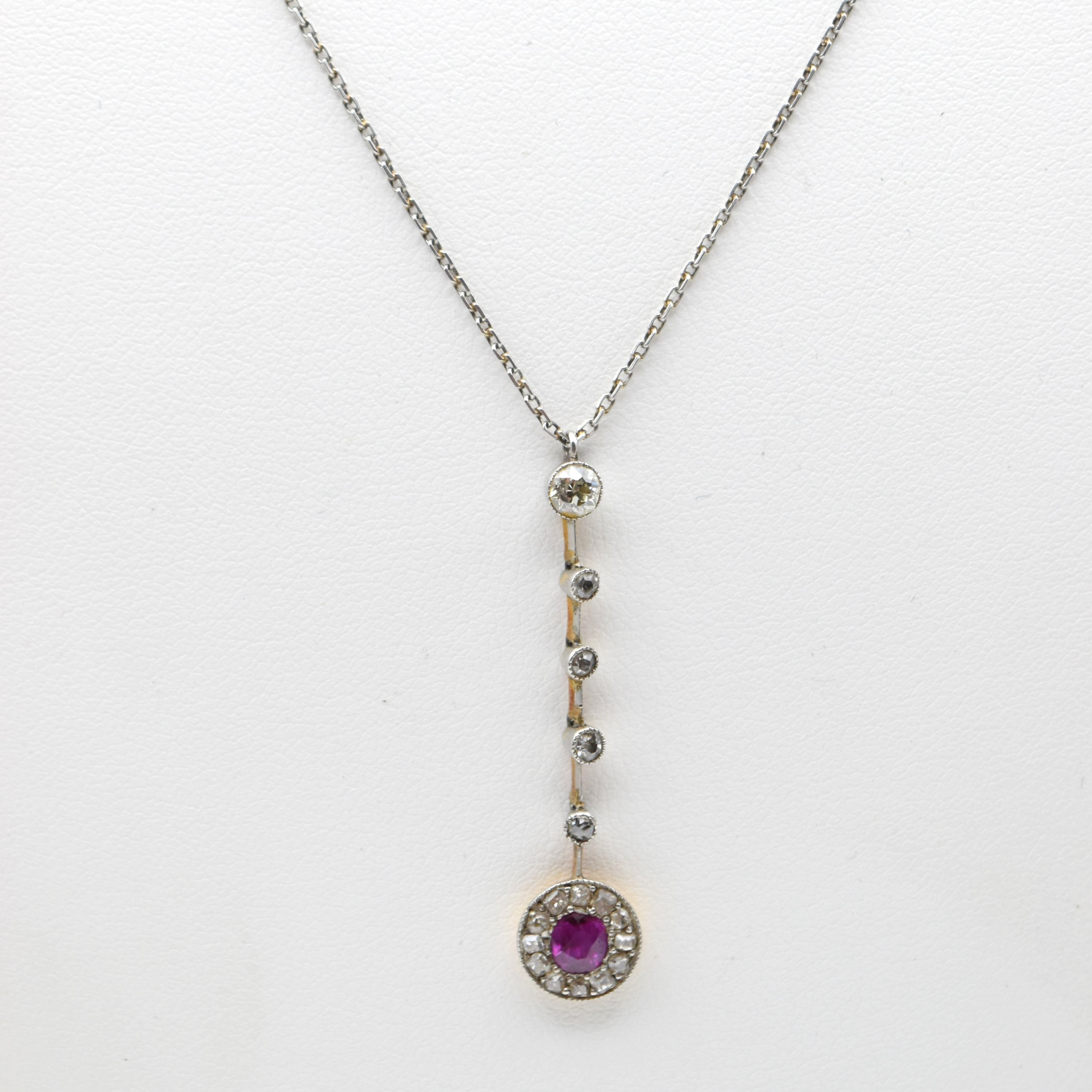 Halsketting met hanger in 18 kt geel- en witgoud en platina bezet met 16 diamanten oud slijpsel +/- 0.25 kt en 1 diamant DIP slijpsel +/- 0.15 kt (1 robijn) - 4.2 gr bruto (36 + 6 cm)