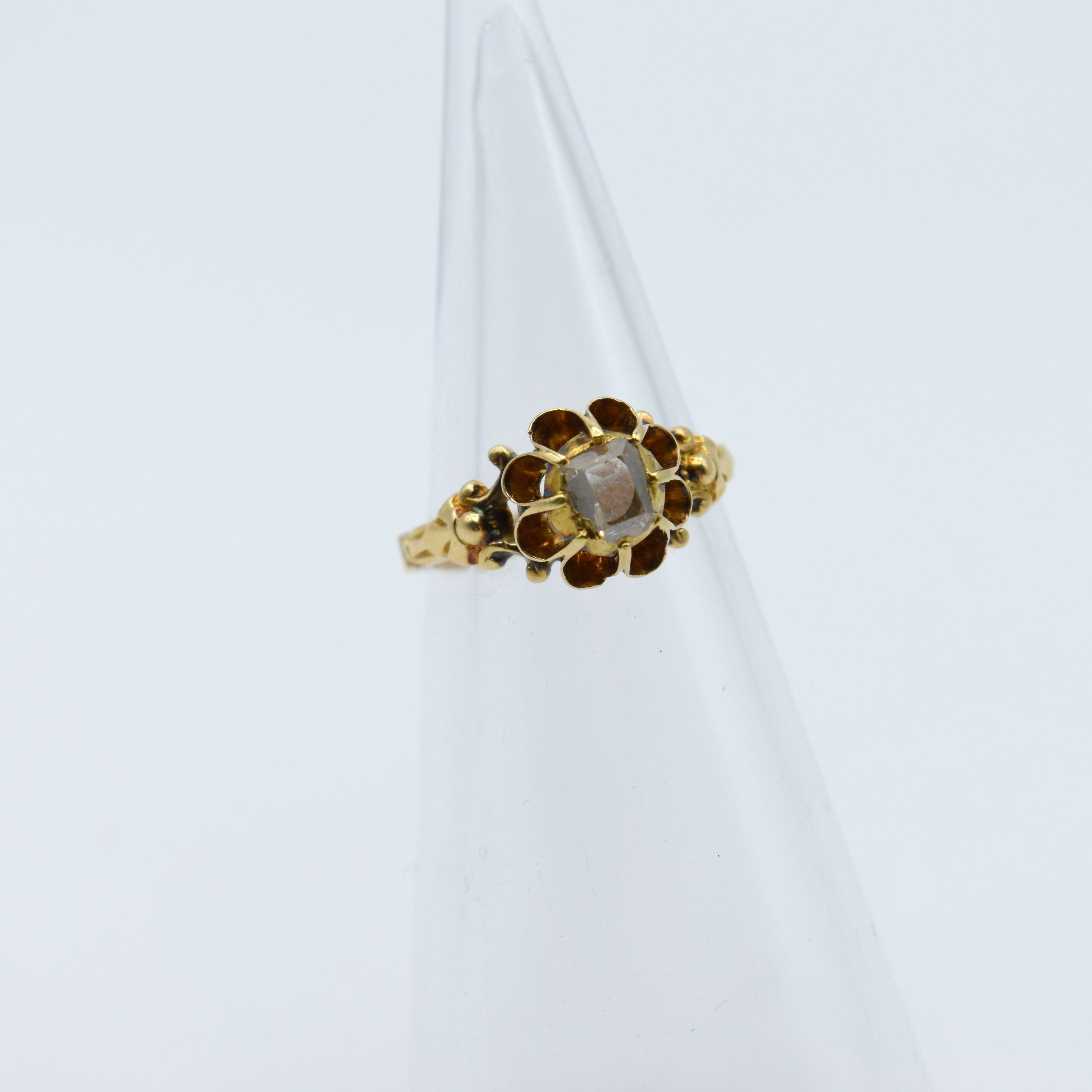 Ring in 18 kt geelgoud bezet met 1 diamant oud slijpsel +/- 0.35 kt - 3.4 gr (Maat: 51.5)
