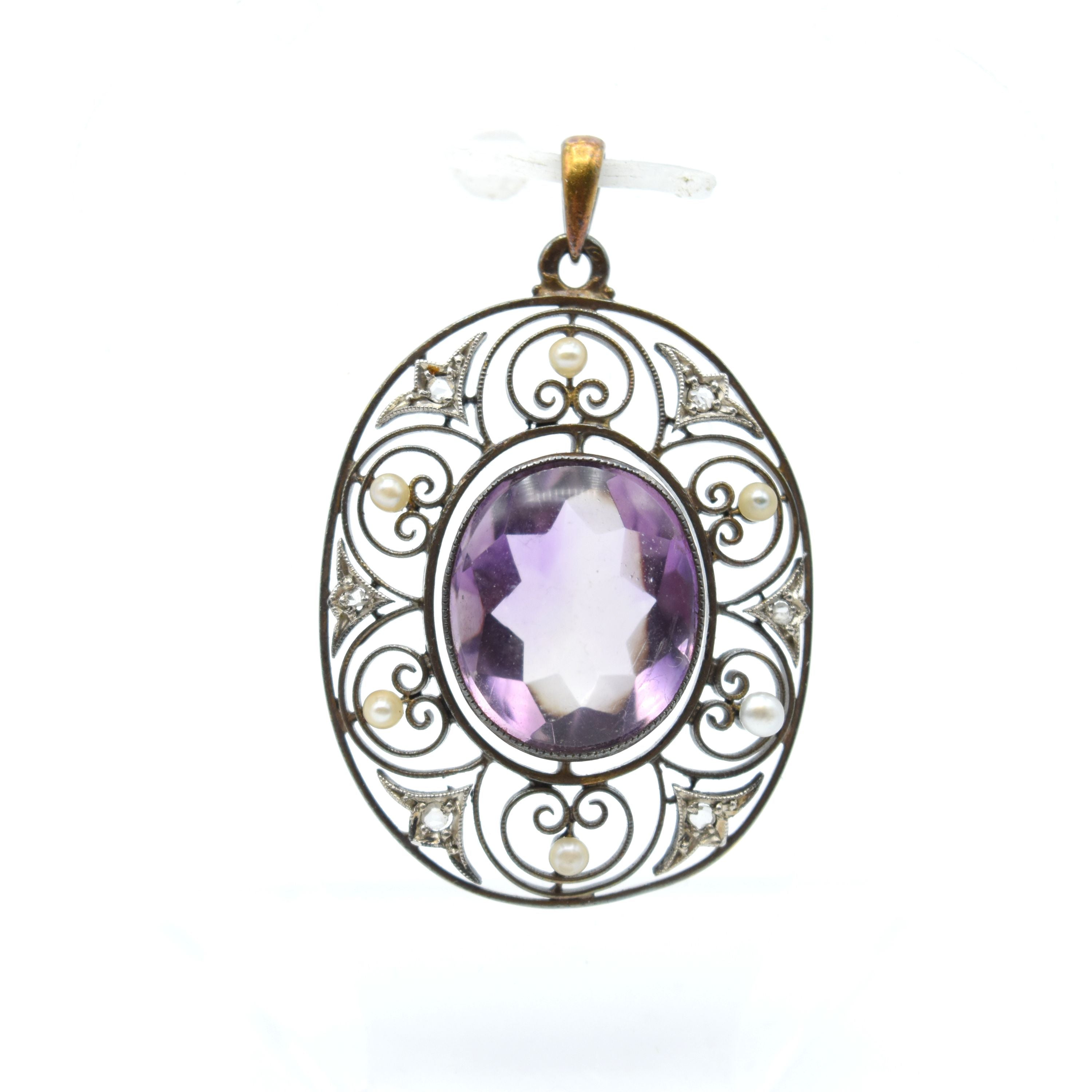 Hanger in 14 kt geelgoud en zilver bezet met diamantscherfjes (parels, kleursteen, steen licht gekrast) - 5.2 gr bruto