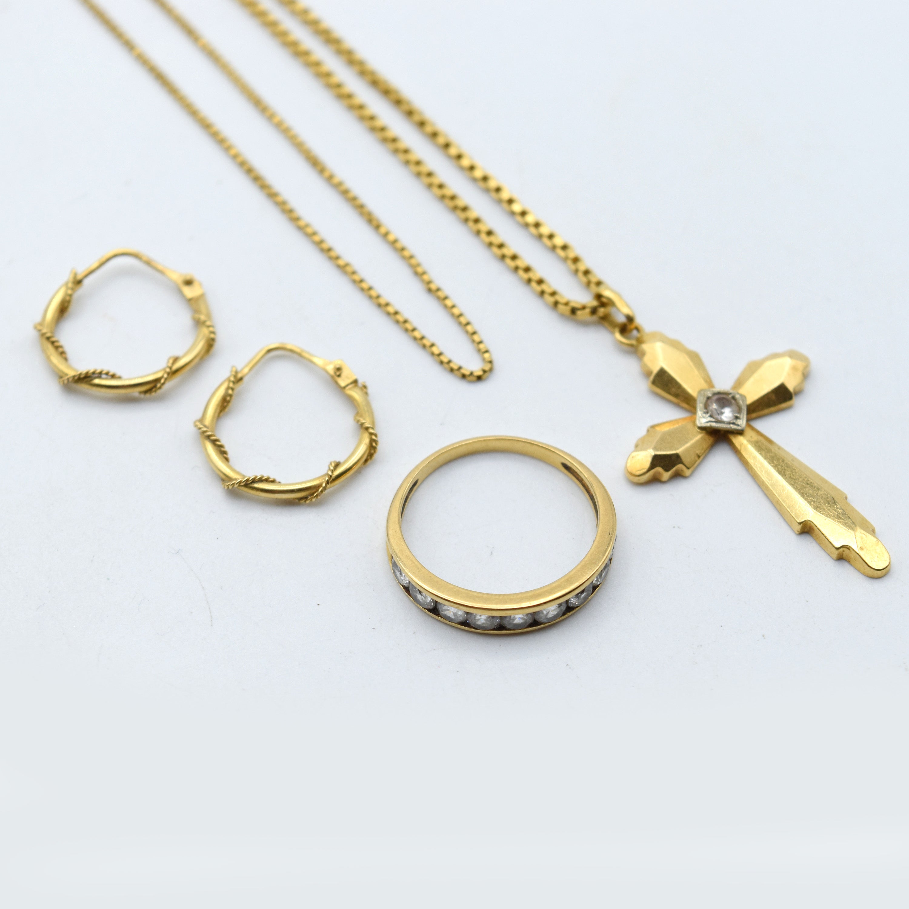 Ring, 2 halskettingen, kruis en 2 oorringen in 18 kt geelgoud (valse stenen, licht gedeukt) - 17.3 gr bruto (Maat: 54) (48 & 50 cm)