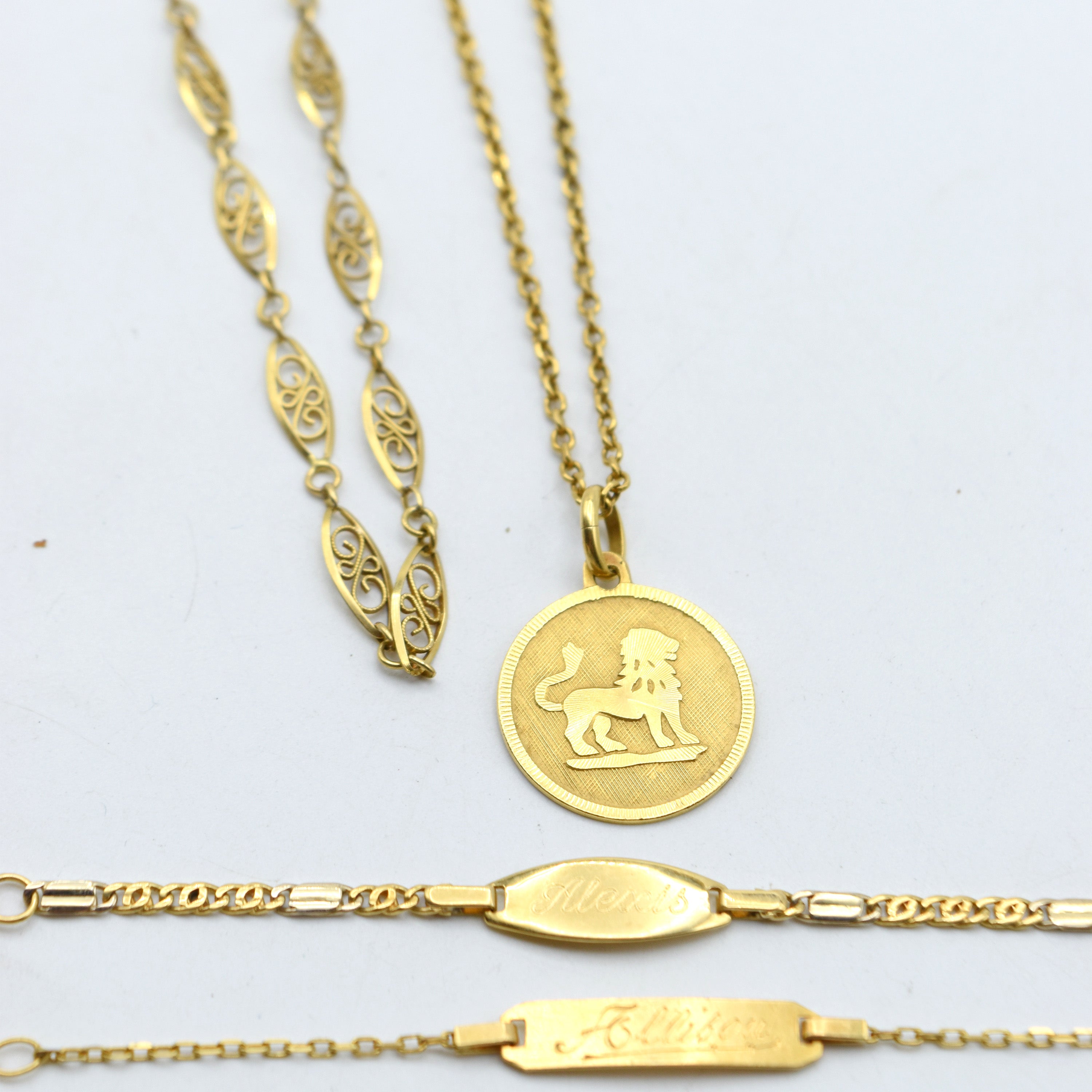 2 halskettingen, hanger en 2 schakelarmbanden in 18 kt geel- en witgoud (gepersonnaliseerd, beschadigd, gebroken) - 21.5 gr (55, 43, 15 & 14 cm)