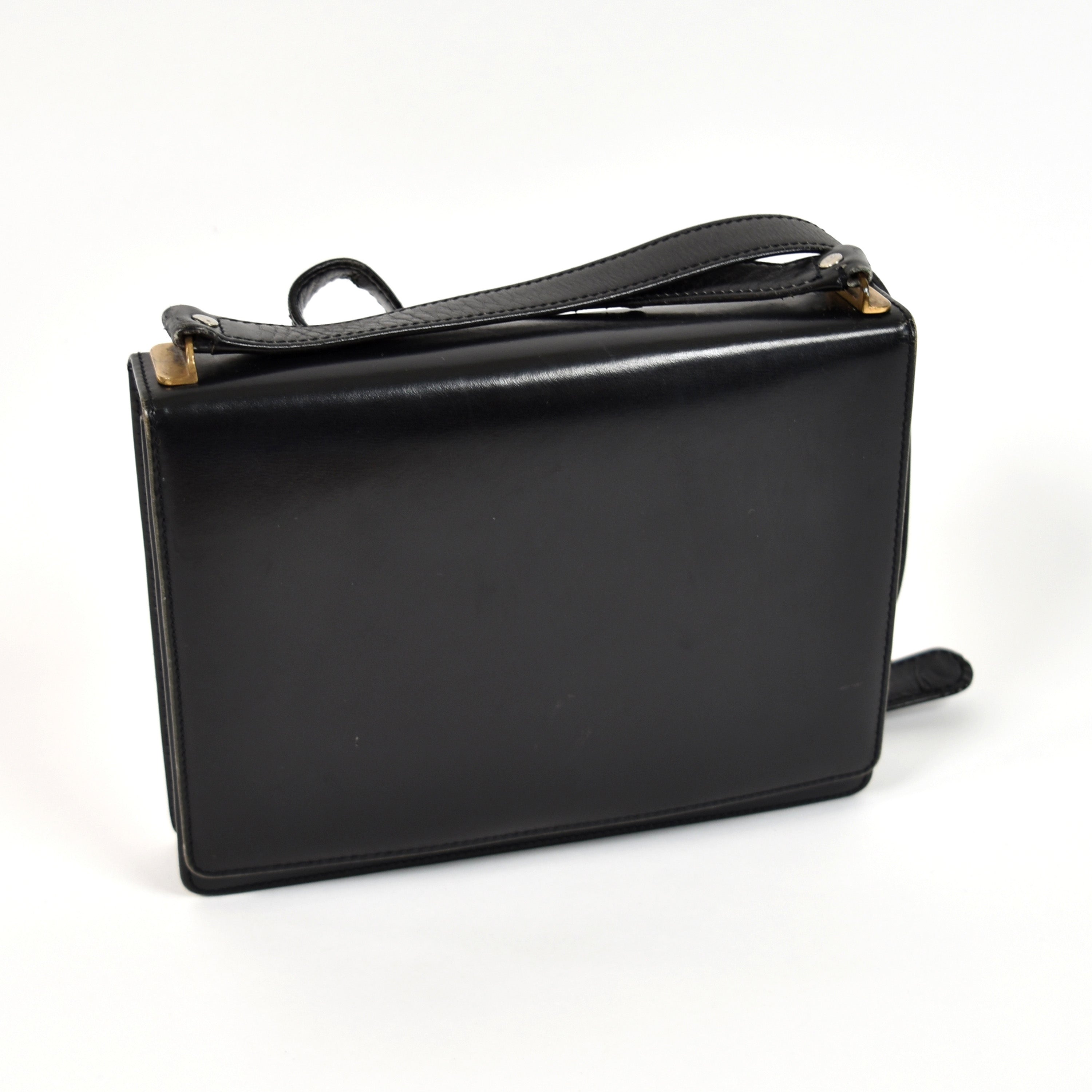 Vintage zak met schouderriem in zwart leder DELVAUX (schouderriem beschadigd) (21 x 16 x 4 cm) + spiegel + garantie
