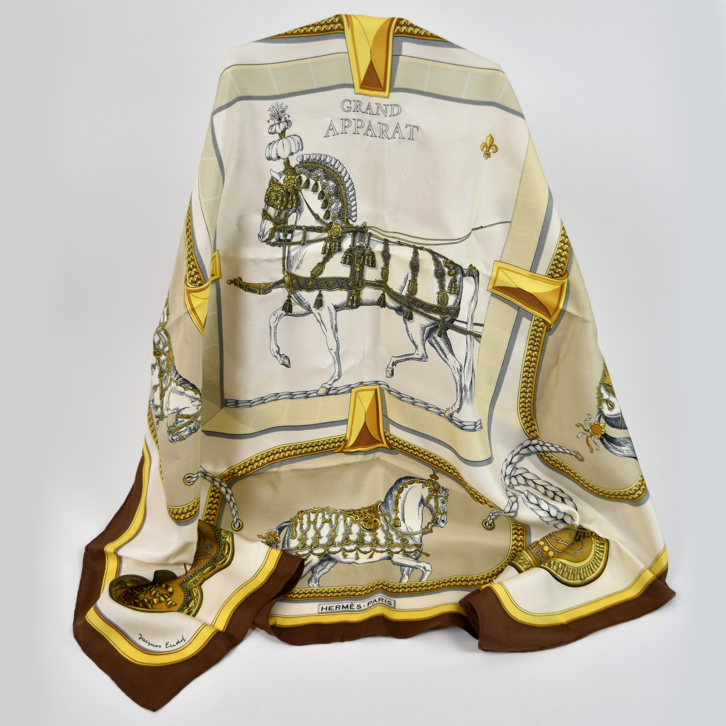 Zijden schaal HERMES "Grand Apparat" door Jacques Eudef (zeer licht bevlekt) (90 x 86 cm) + doos Hèrmes