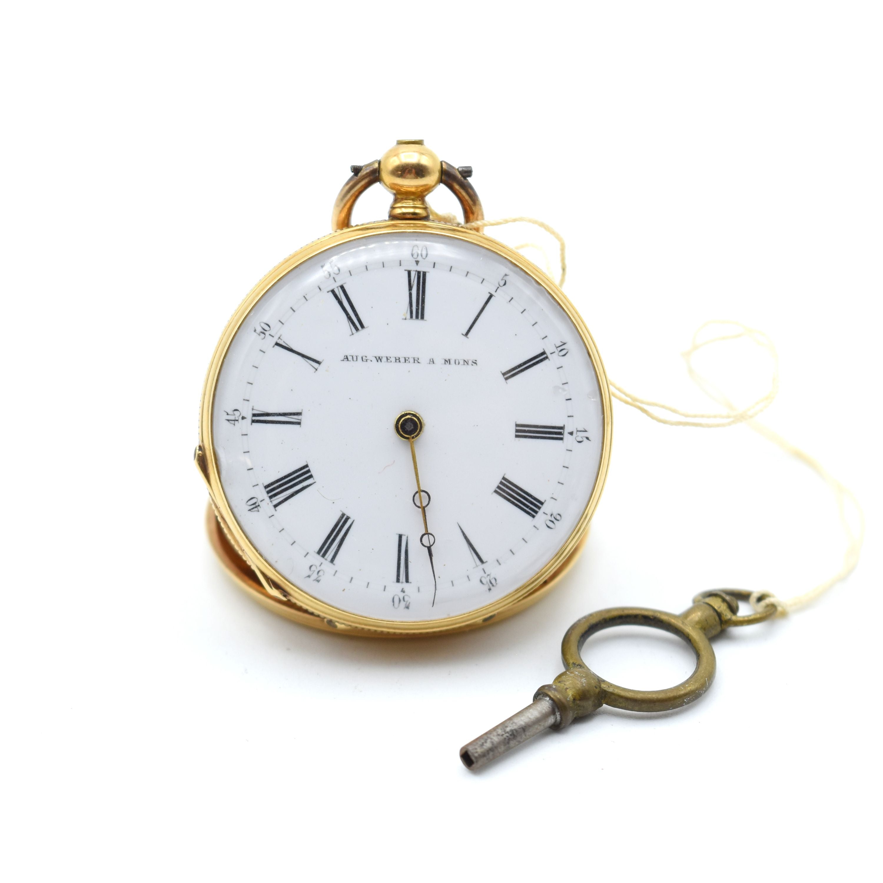Zakhorloge met 2 cuvetten in 18 kt geelgoud H.WERER A MONS mecanisch ( glas licht beschadigd ) - 33.3 gr bruto + sleutel in metaal