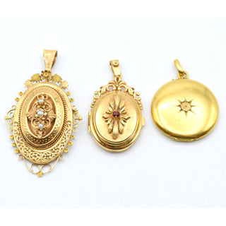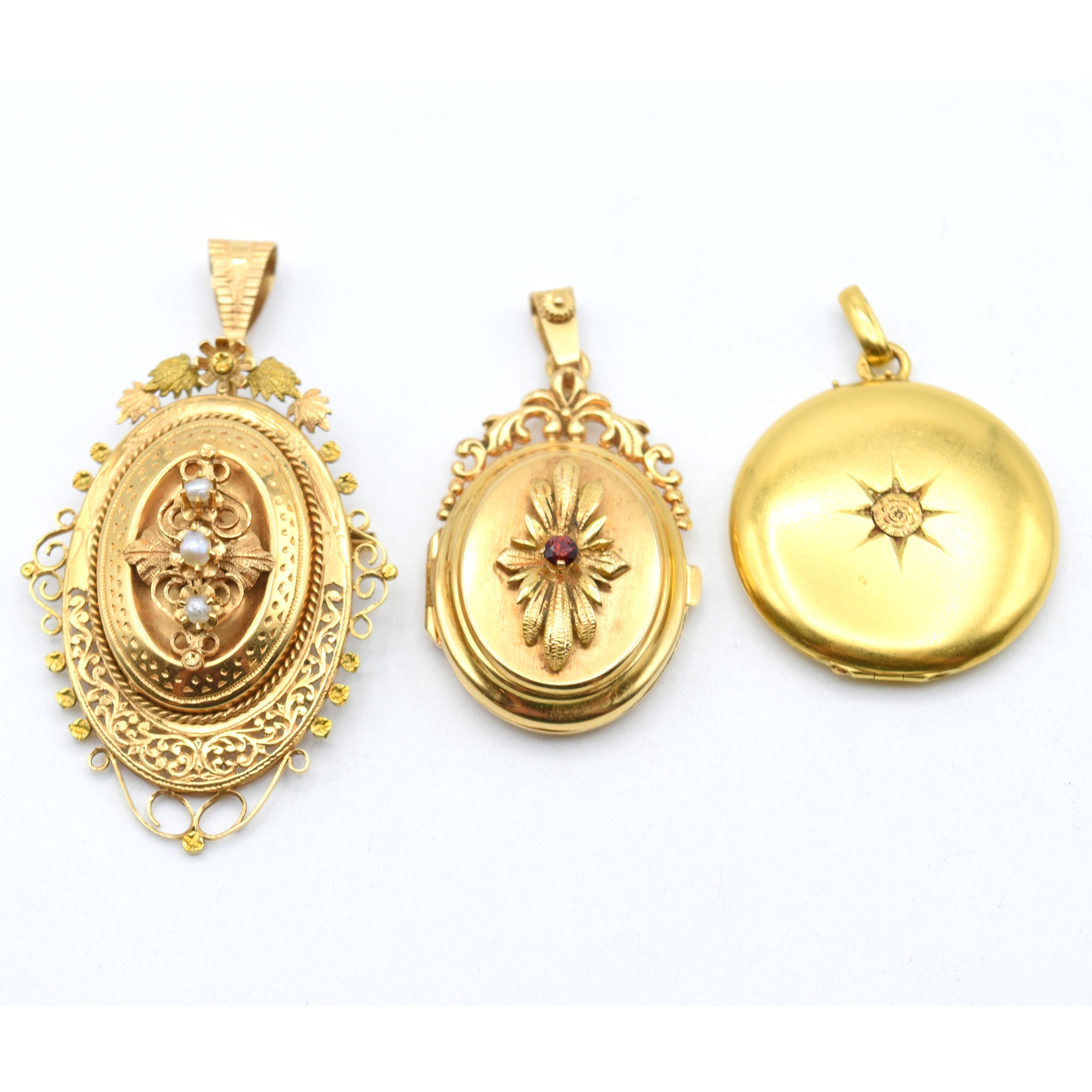 2 hangers (fotohouder) en 1 hanger/borstspeld in 18 kt geelgoud (parels, kleursteen, gedeukt) - 25.9 g bruto