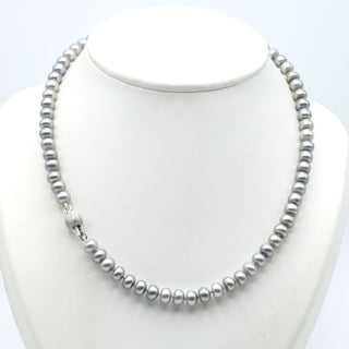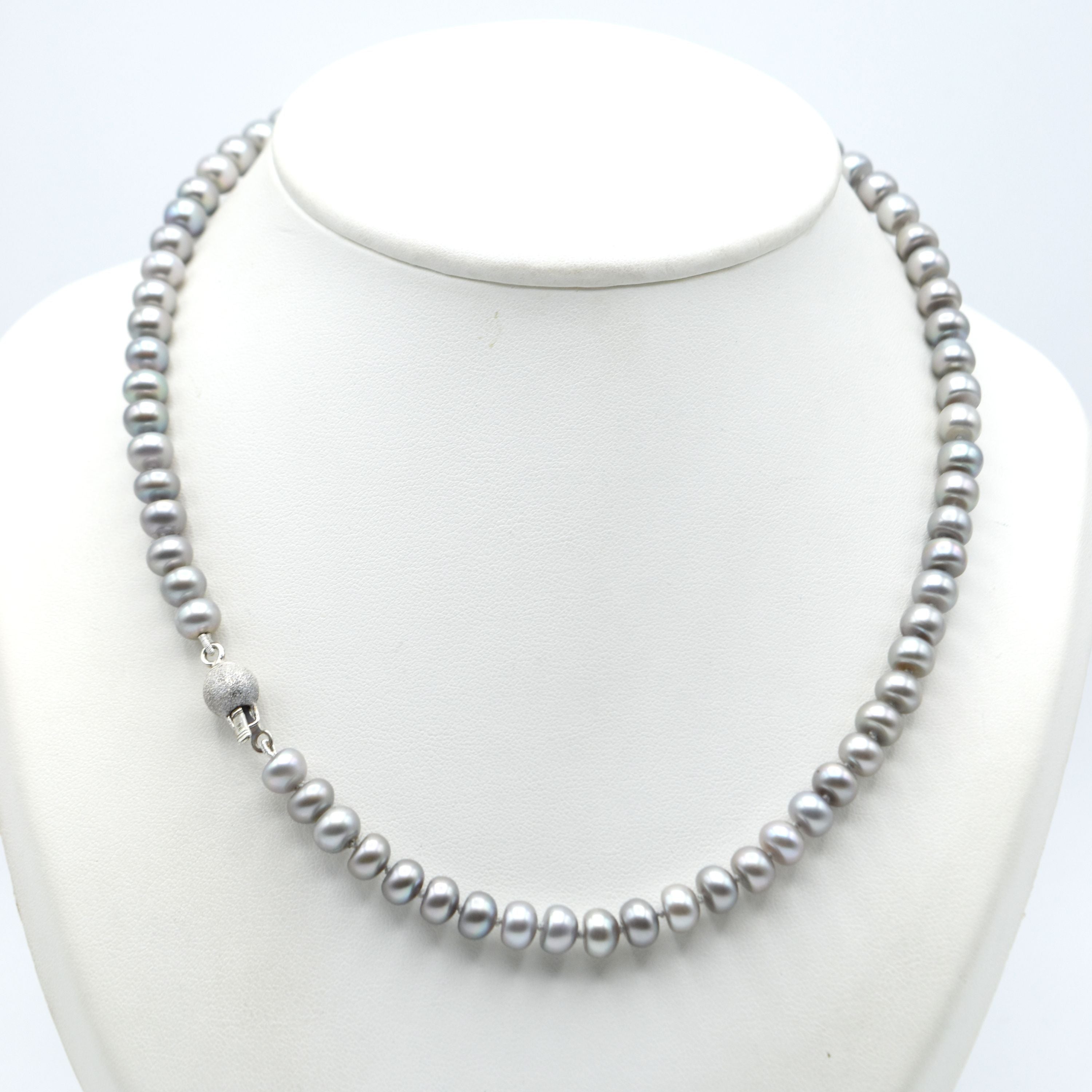 Halssnoer van grijze parels (+/- 6.5 mm) met sluiting in zilver (46.5 cm)
