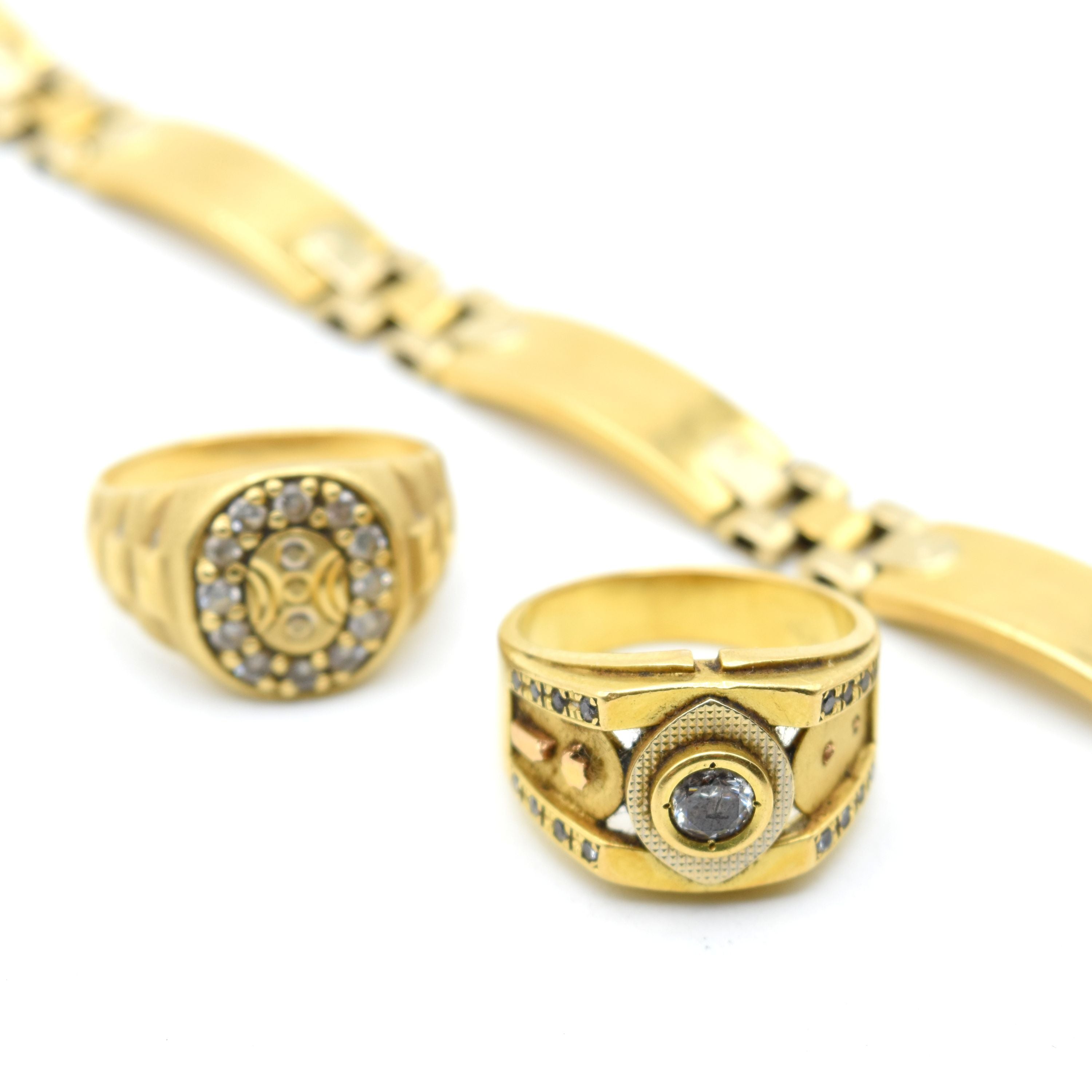 2 zegelringen en armband in 18 kt geel- en witgoud (valse stenen, stukken ontbreken, gedeukt, gebroken) - 44 g bruto (Maten: 60 & 61) (20 cm)