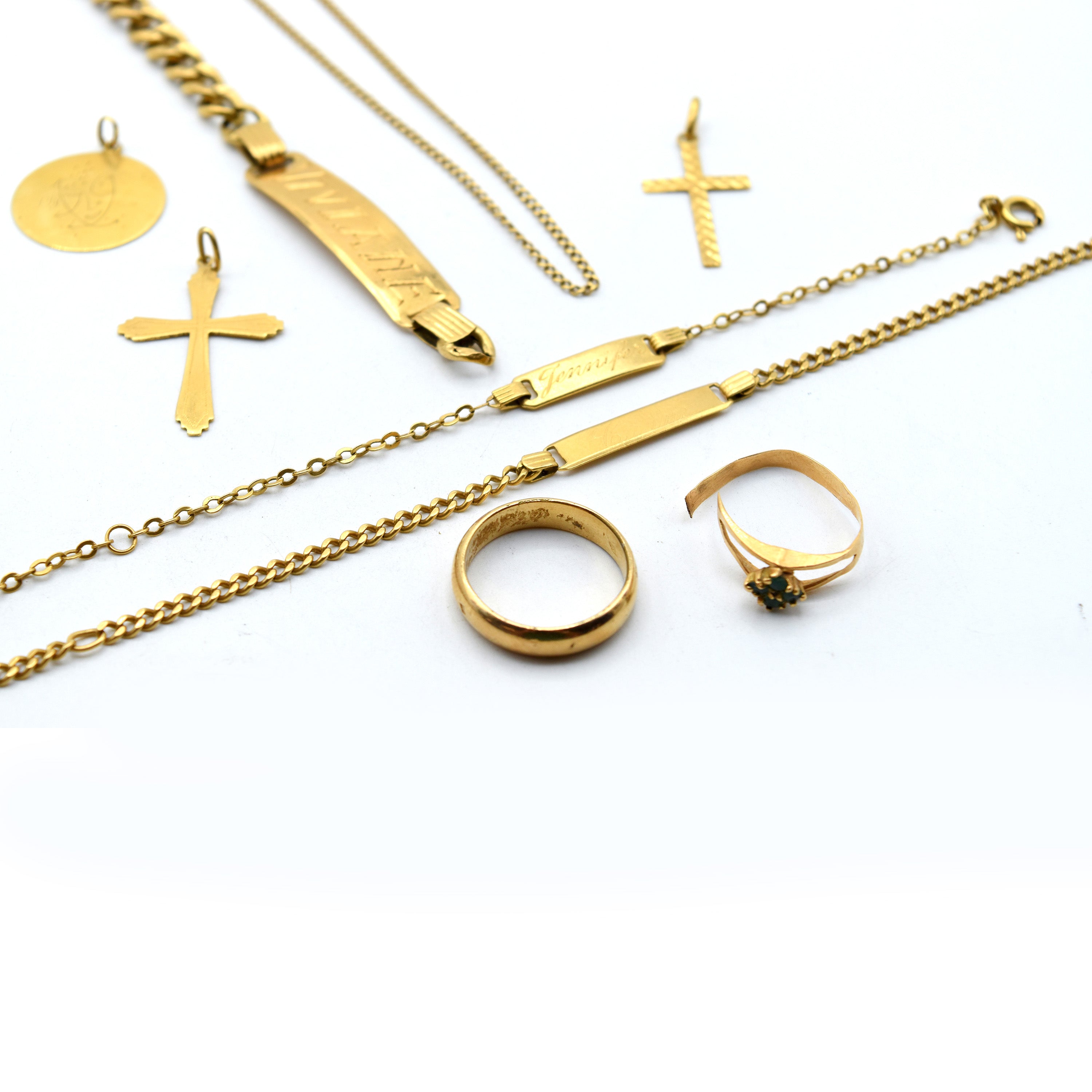 Trouwring in 14 kt geelgoud (beschadigd) - 3.2 g (Maat: 55.5) Ring, halsketting, hanger, 2 kruizen en 3 schakelarmbanden in 18 kt geelgoud (kleurstenen, gepersonaliseerd, beschadigd, gedeukt, gebroken) - 26.2 g bruto (Maat: 51) (59, 21, 18.5 & 16 cm)