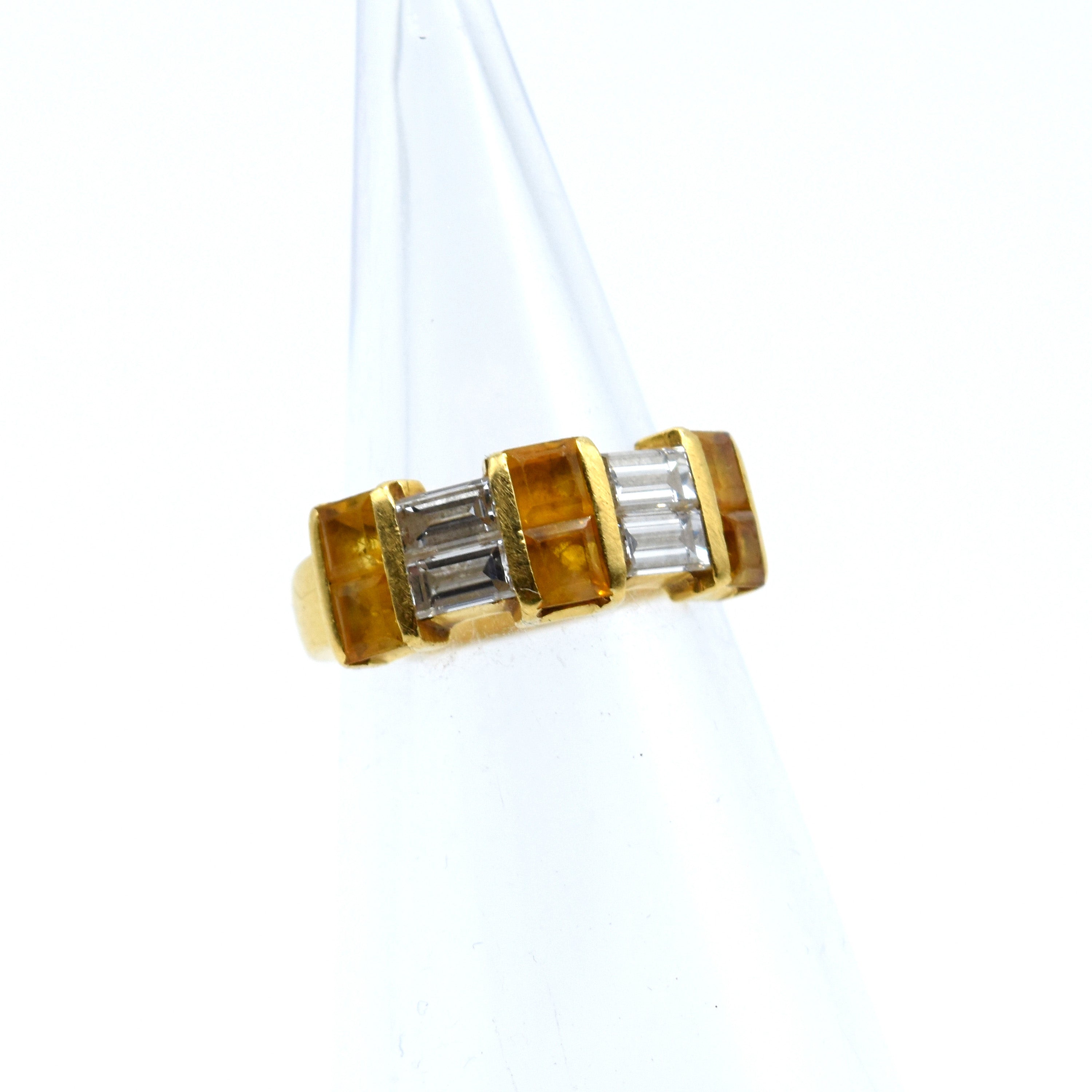Ring in 18 kt geelgoud bezet met 4 diamanten baguetteslijpsel +/- 0.50 kt (kleurstenen) - 5.8 g (Maat: 51)