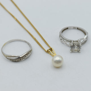 Ring in 9 kt witgoud bezet met 2 diamanten 8/8 slijpsel +/- 0.01 kt - 1.5 g (Maat: 55.5) Ring in 14 kt witgoud (valse stenen) - 2.5 g bruto (Maat: 51) Halsketting en hanger in 18 kt geelgoud bezet met 1 parel - 4.3 g bruto (42 cm)