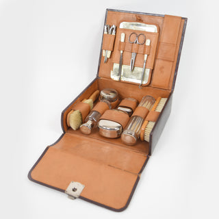Toiletartikelen voor op reis in zijn origineel koffertje (gedeelten beschadigd, gedeelten verroest) (21.5 x 19.5 x 7 cm)