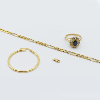 Ring, armband, 1 oorring en sluiting in 18 kt geel- en witgoud (valse stenen, kleursteen, beschadigd, gedeukt) - 13 g bruto (Maat: 55) (19 cm)