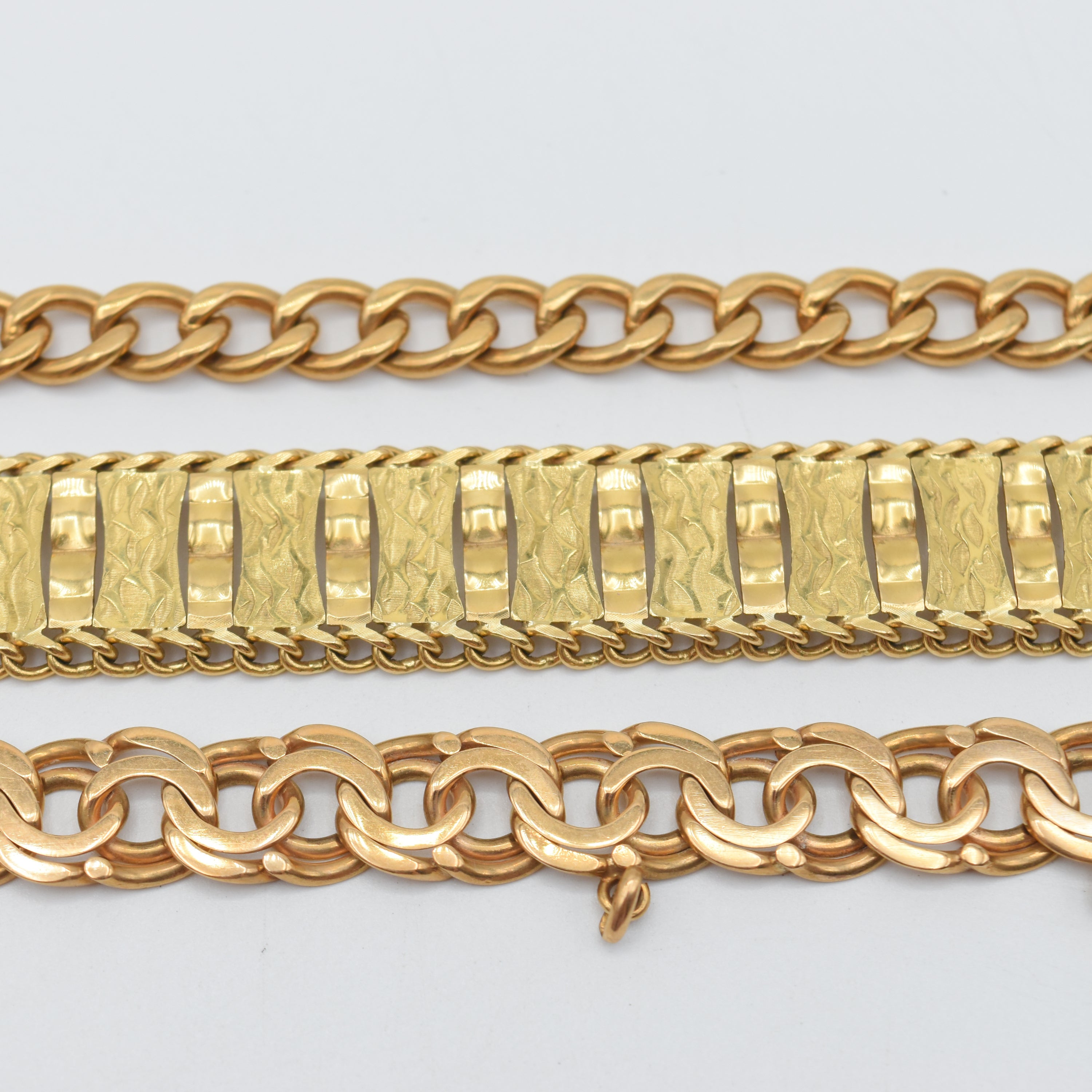 3 armbanden in 18 kt rosé- en geelgoud (4 hangers ontbreken, 2 veiligheidskettingen ontbreken) 99.3 g (20, 19.5 & 19 cm)