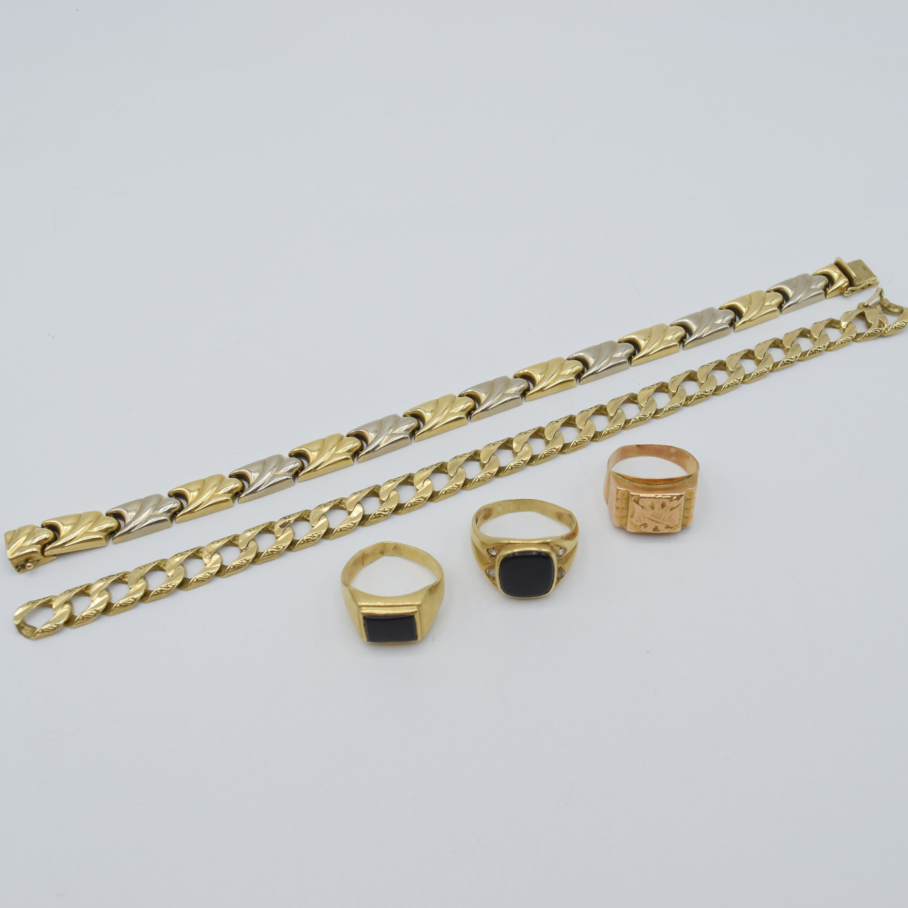 3 ringen en 2 armbanden in 14 kt geel- en witgoud (valse stenen, kleurstenen, beschadigd, gedeukt, gebroken) - 53.6 g bruto (Maten: 57, 55 & 54) (20.5 & 20 cm)