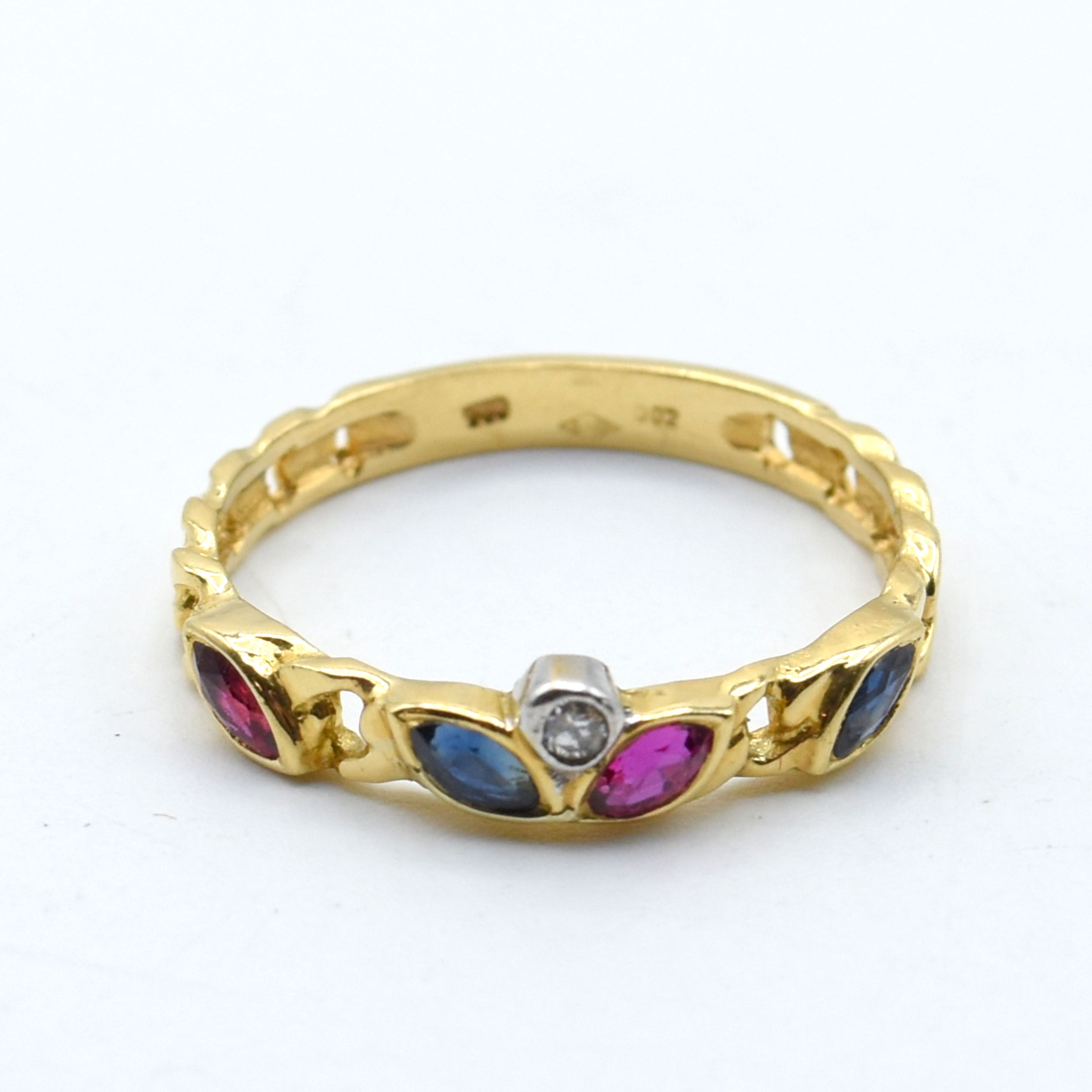 Ring 18 kt geel- en witgoud bezet met 1 briljant +/- 0.02 kt 2 saffieren en 2 robijnen - 2.1 g bruto (Maat: 54)