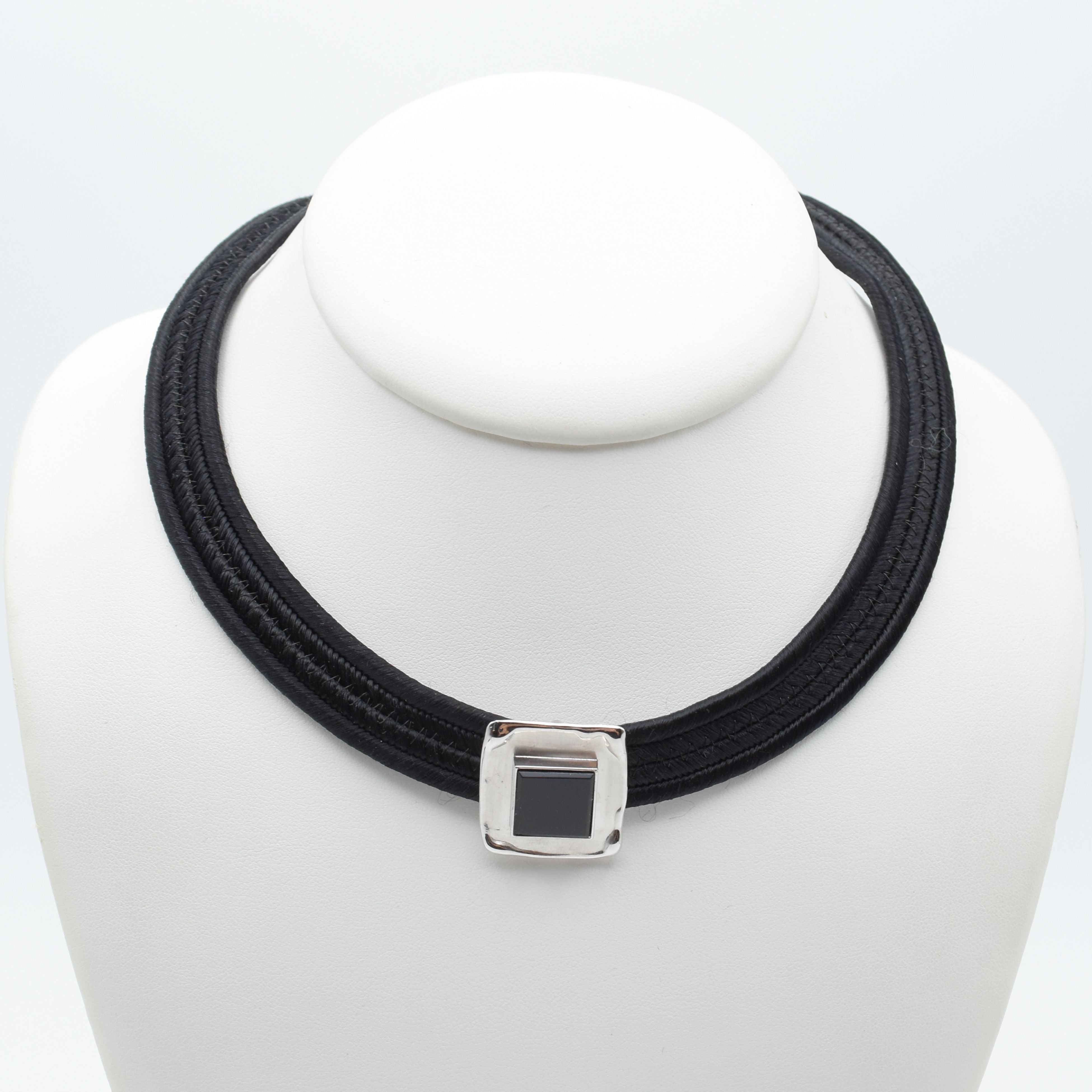 Halsketting in passementerie met vastgehechte hanger 18 kt witgoud bezet met 1 onyx (+/- 40 cm) + doos