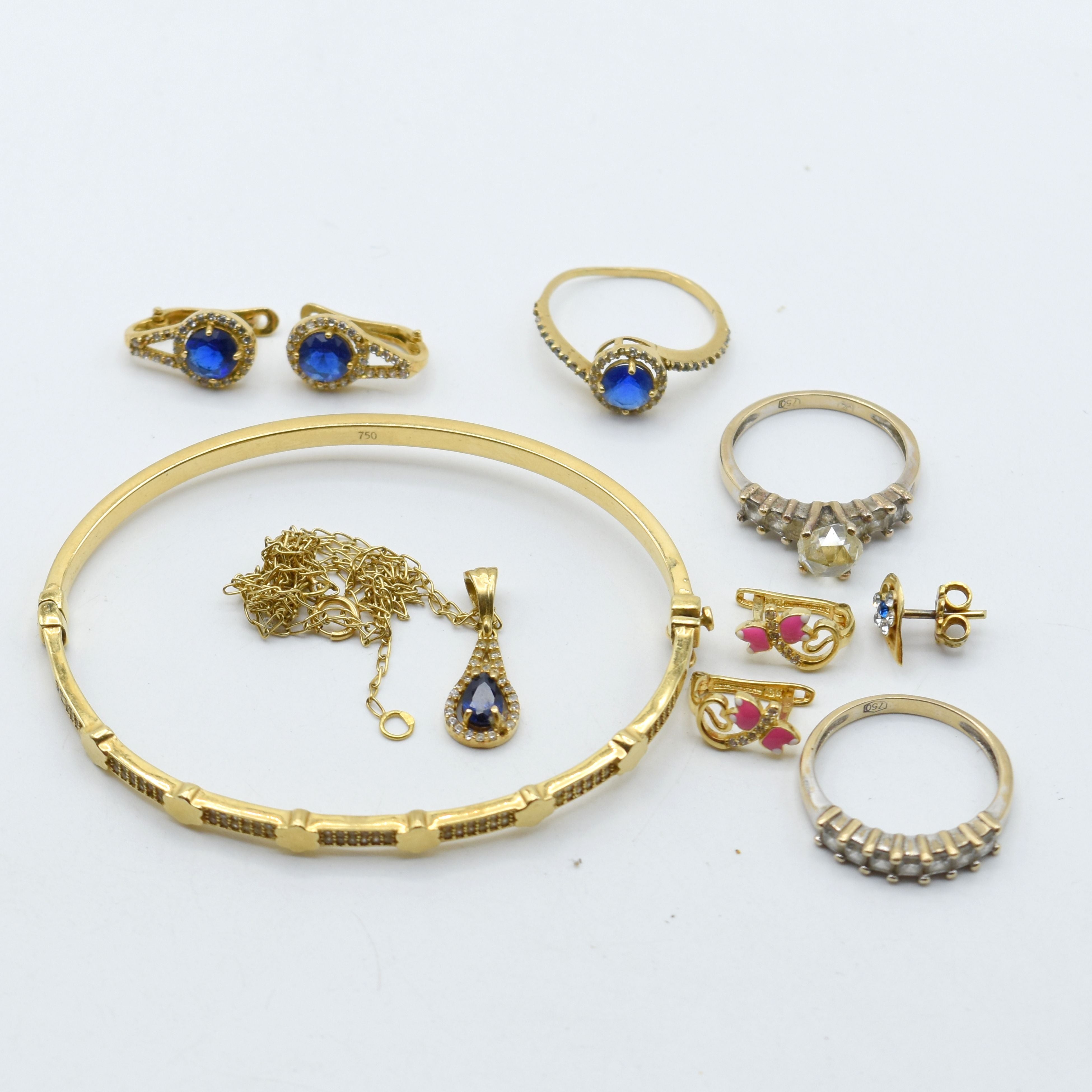 3 ringen, halsketting, hanger, onbuigzame armband en 4 oorringen 18 kt geel- en witgoud bezet met 1 diamantroosje (valse stenen, kleurstenen, stenen ontbreken, steen beschadigd, gedeukt, knopen) - 22.3 g bruto (Maten: 54.5, 55 & 55.5) (6 x 5 cm) 1 oorbel 14 kt geelgoud (valse stenen, kleurstenen, steen ontbreekt, beschadigd, gedeukt) - 0.6 g bruto