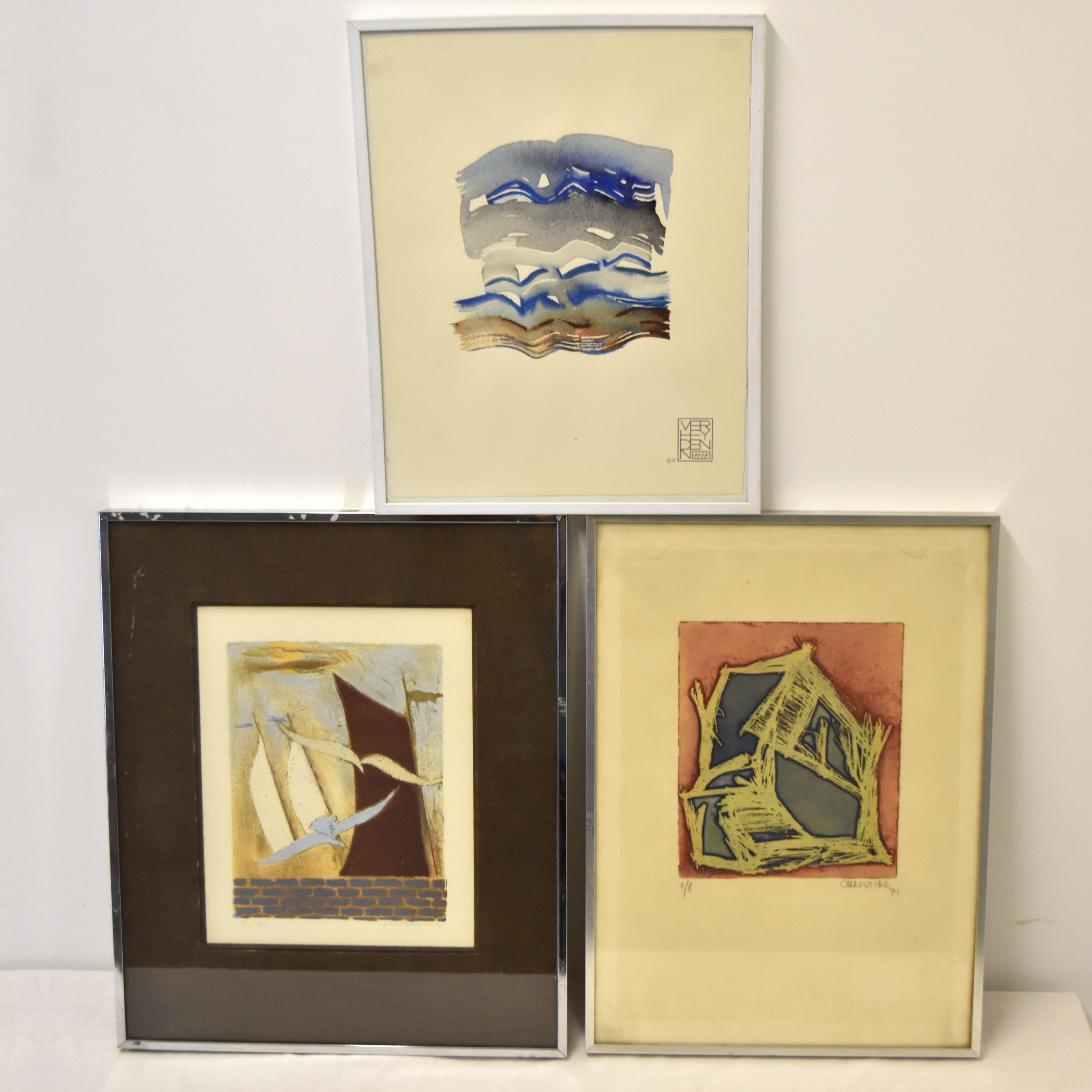 Lot van 3 lithografies bestaande uit: De golven getekend VERHEYDEN (23 x 29 cm), De meeuwen getekend J.M. OOSTENYNCK (18 x 23 cm) en Abstract getekend CHRISTINE (14 x 17 cm)