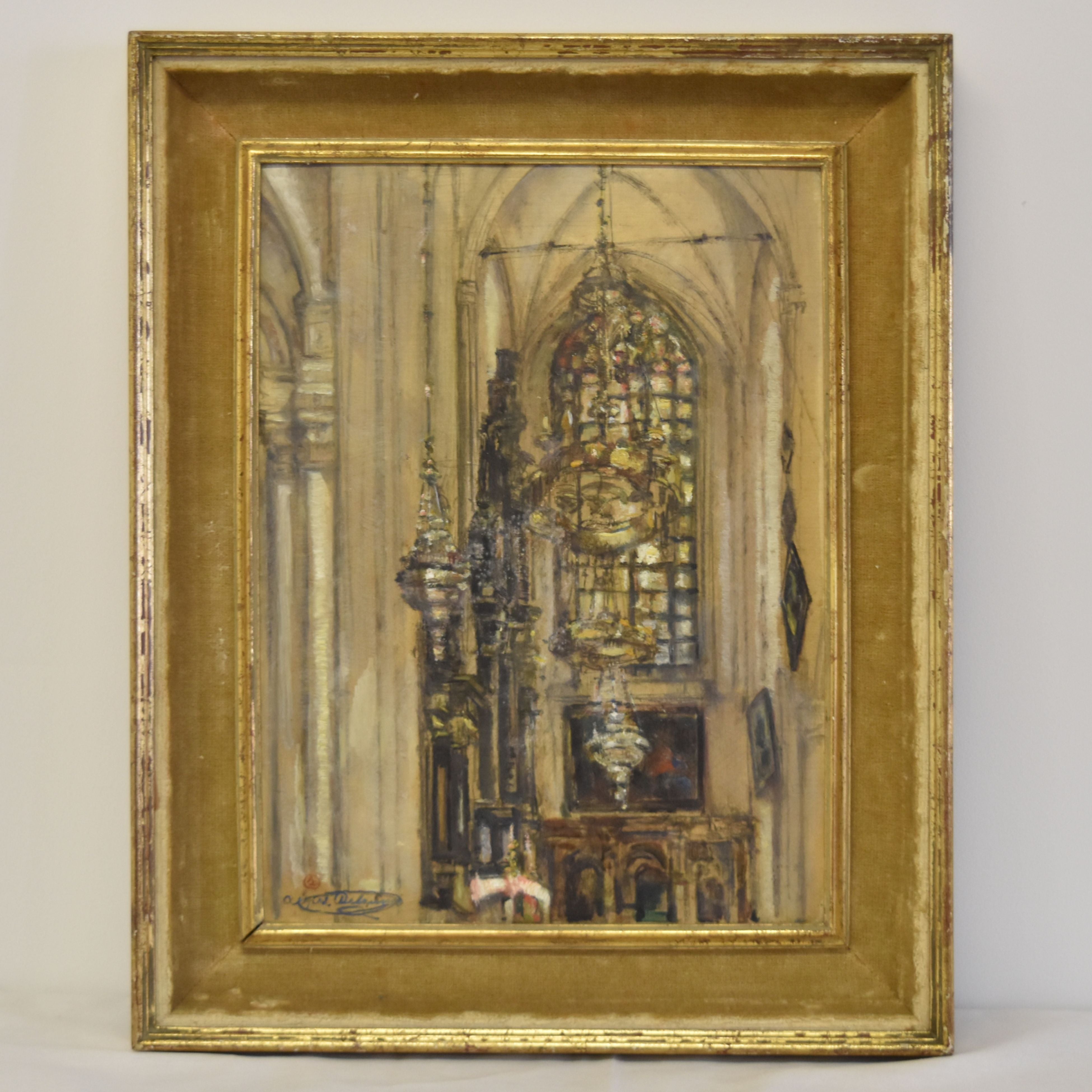 Olie op papier met onleesbare handtekening: Binnenaanzicht van een kerk (kader beschadigd) (25 x 33 cm)