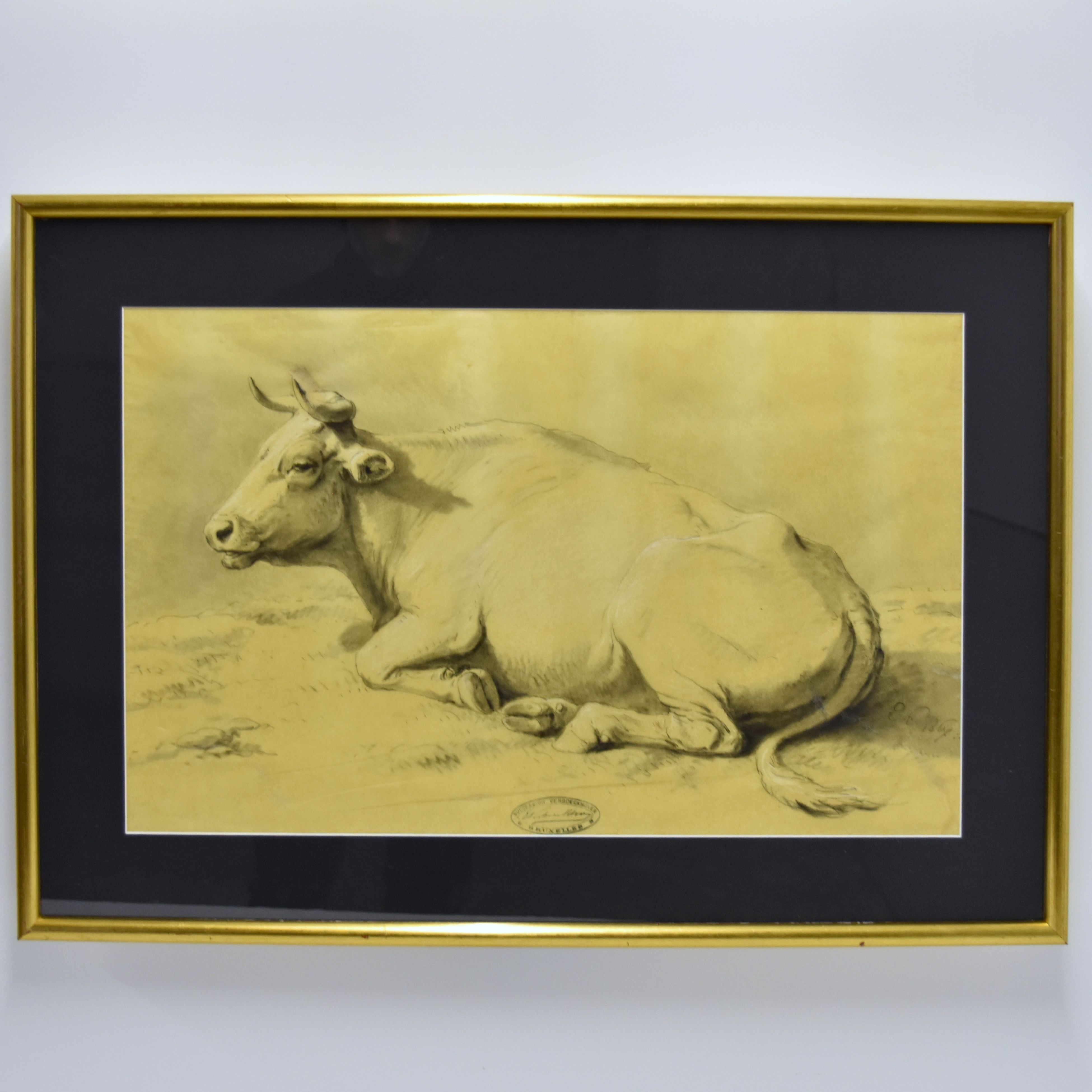 Potloodtekening op papier getekend Eugène VERBOEKHOVEN: Liggende koe (59 x 36.5 cm)