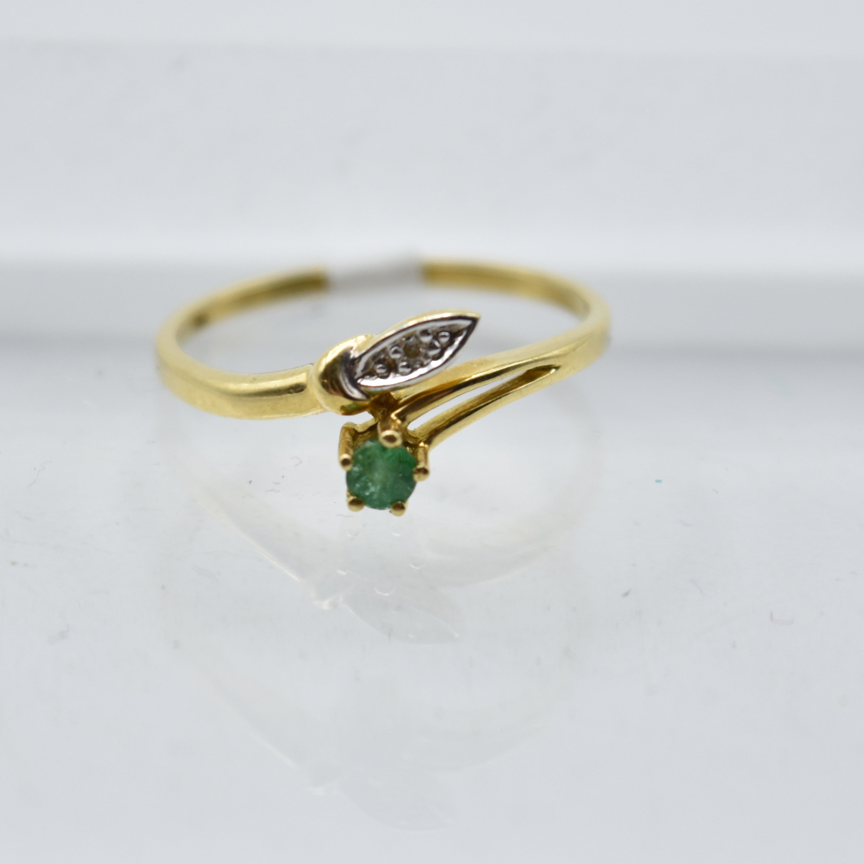Ring in 18 kt geel- en witgoud bezet met 1 diamant 8/8 slijpsel +/- 0.01 kt en 1 smaragd - 1.4 g (Maat: 50)