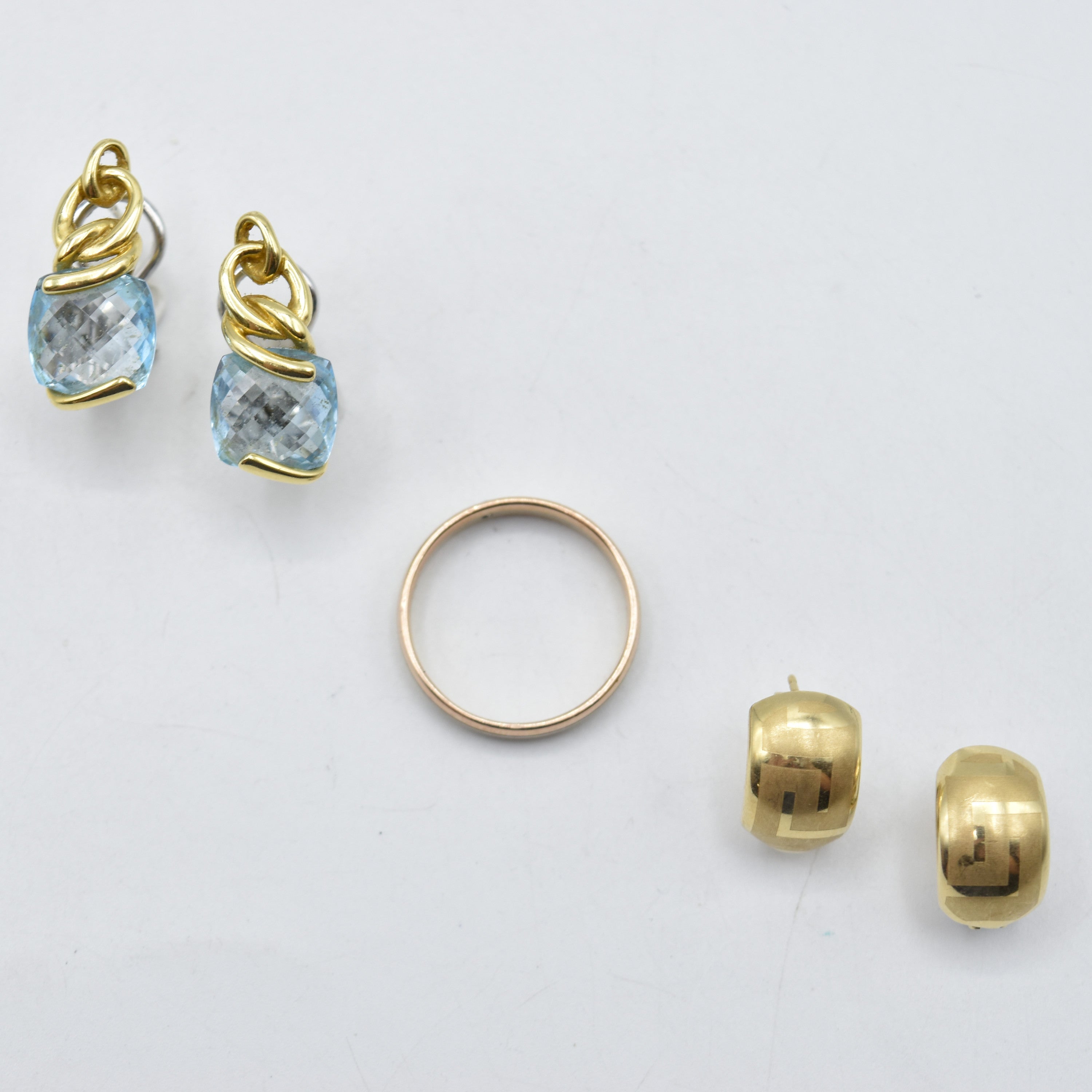 2 oorringen in 18 kt geel- en witgoud (kleurstenen) - 11 g bruto Trouwring en 2 oorringen in 14 kt 3-kleurengoud bezet met 1 briljant +/- 0.04 kt (gedeelten in metaal, gegraveerd, gepersonaliseerd, gedeukt) - 6.7 g bruto