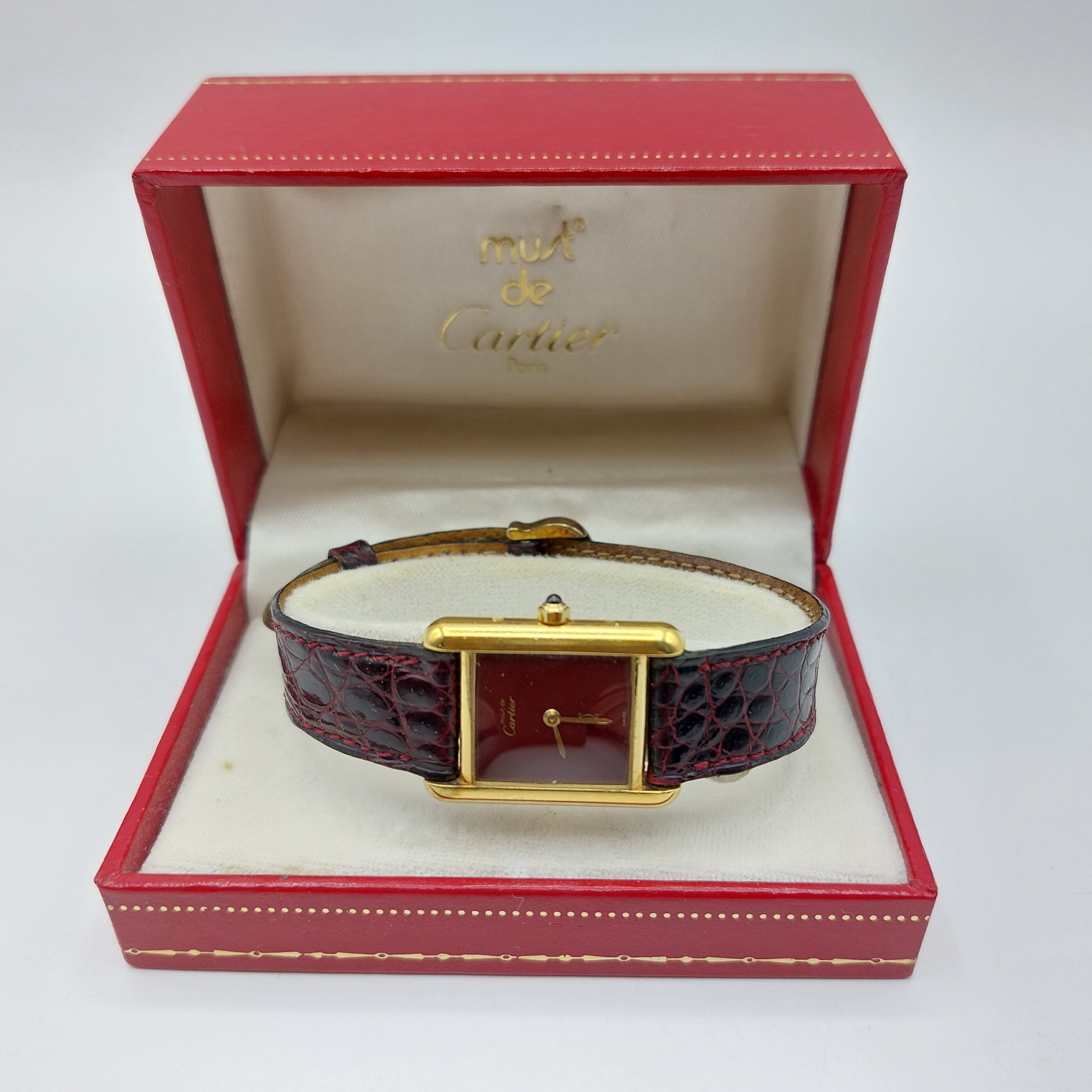 Damepolshorloge in vermeil Must de CARTIER quartz (armband in leder met sluiting in metaal uurwerknr 36600117556, wijzers en wijzerplaat licht beschadigd, beschadigd, geöxideerd) + doos