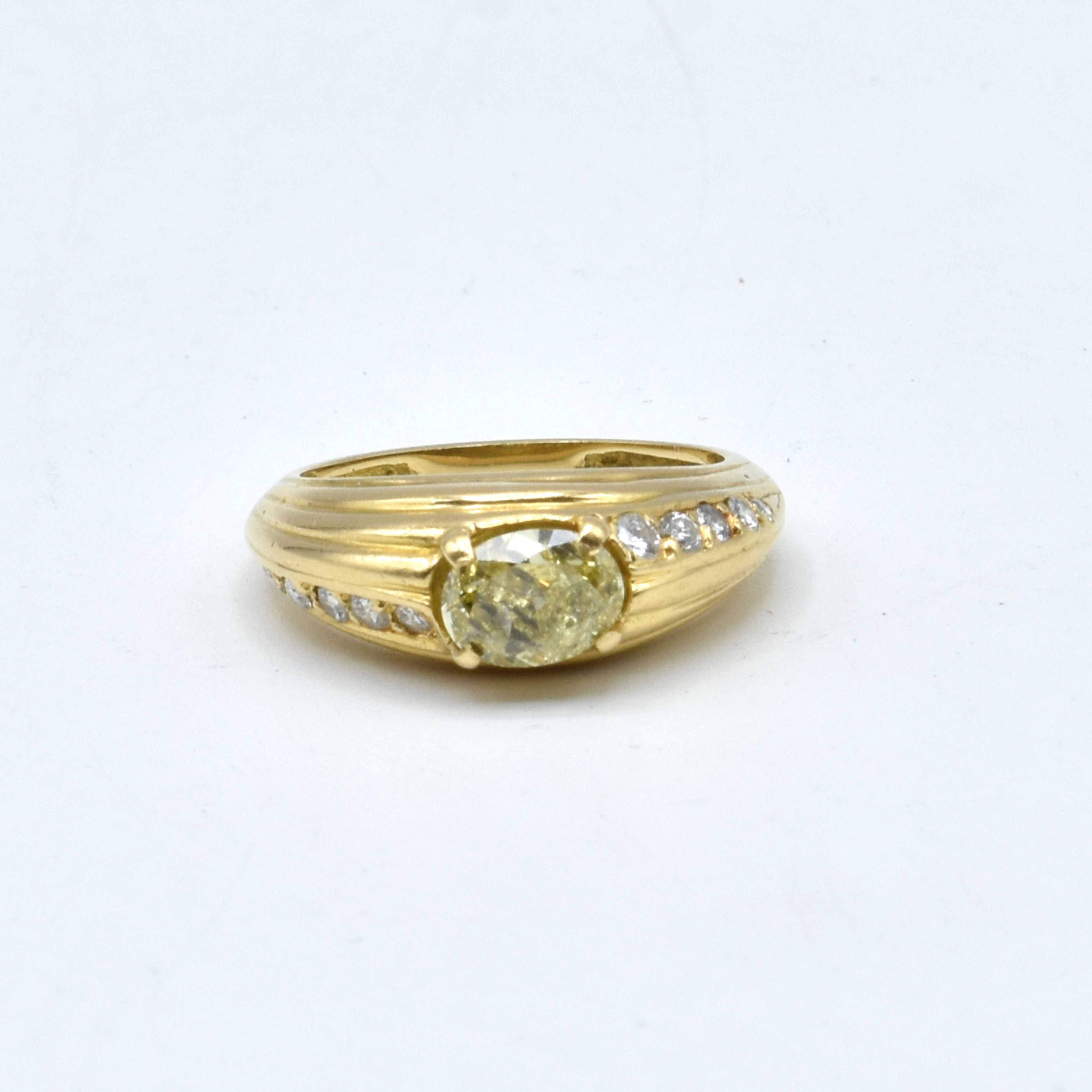 Ring in 18 kt geelgoud bezet met 1 diamant ovaal slijpsel fancy yellow +/- 1.10 kt en 10 briljanten +/- 0.28 kt - 5.1 g bruto + Certificaat GEM REPORT nr 1810019706 AN voor de centrale steen (Taille: 53)