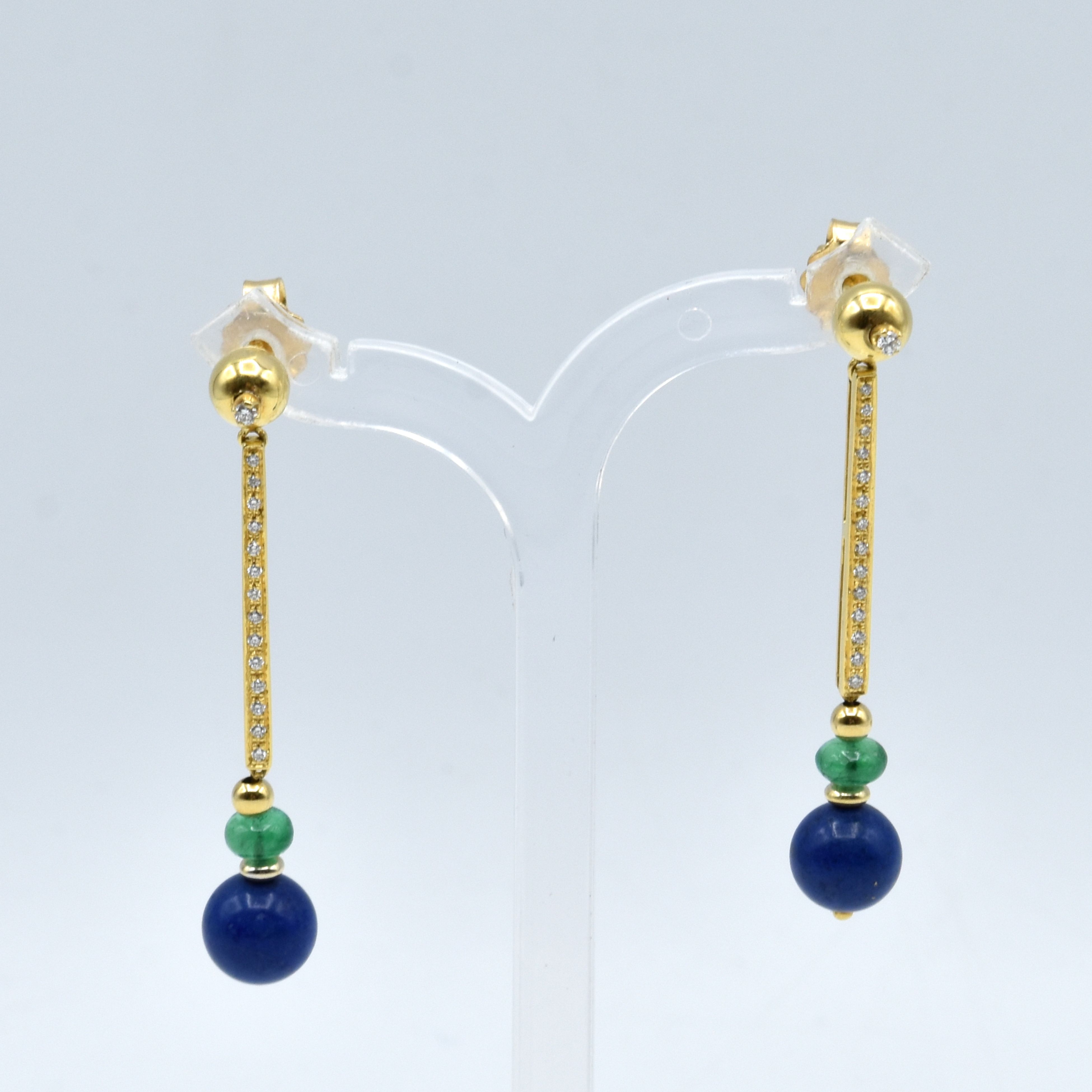 2 oorringen in 18 kt geelgoud bezet met 30 briljanten +/- 0.20 kt, 2 lapis lazuli en 2 smaragden - 3.8 g bruto
