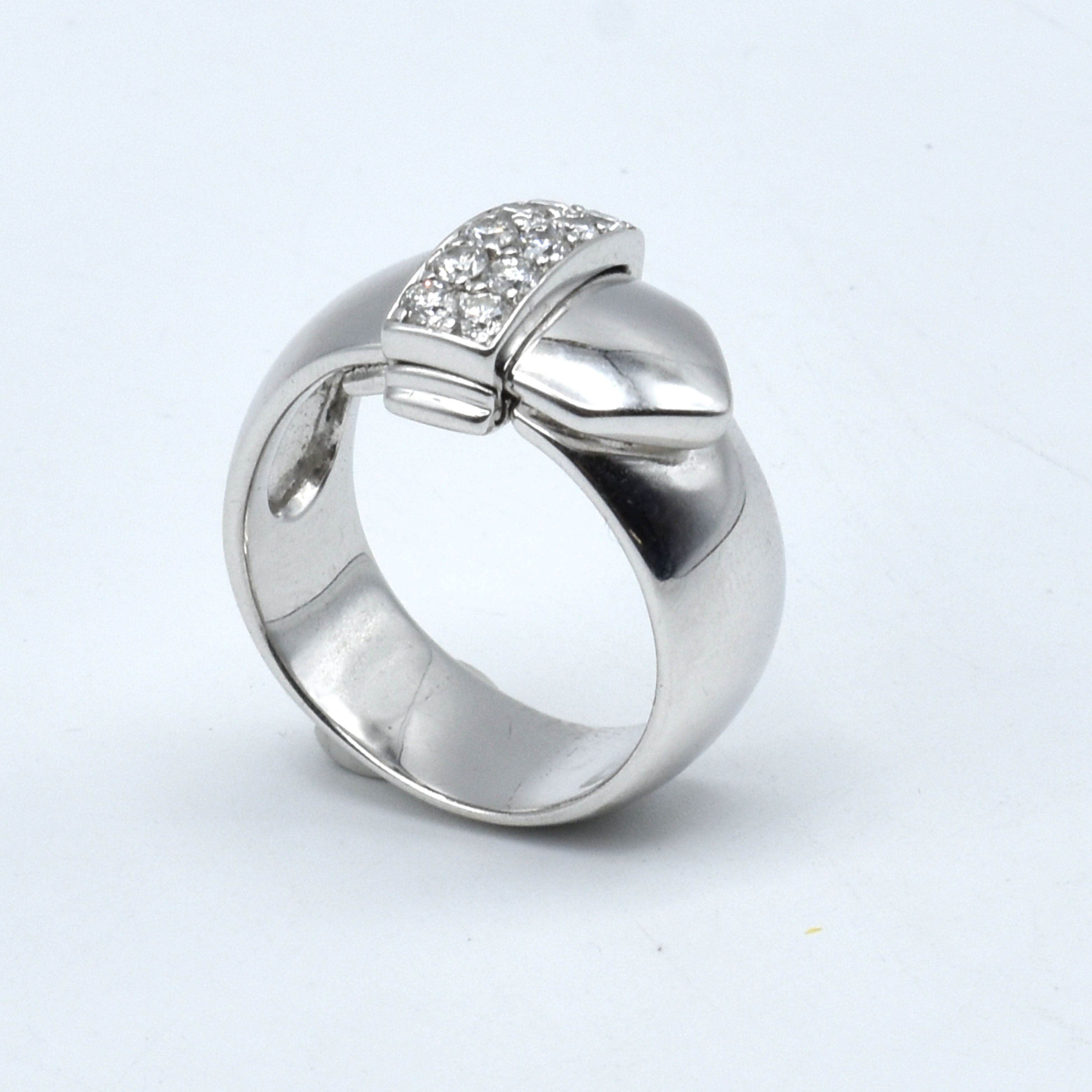 Ring in 18 kt witgoud bestaande uit een verwisselbaar deel bezet met 10 briljanten +/- 0.80 kt en een verwisselbaar stuk in 18 kt witgoud bezet met kleurstenen - 21.1 g (Maat: 62)