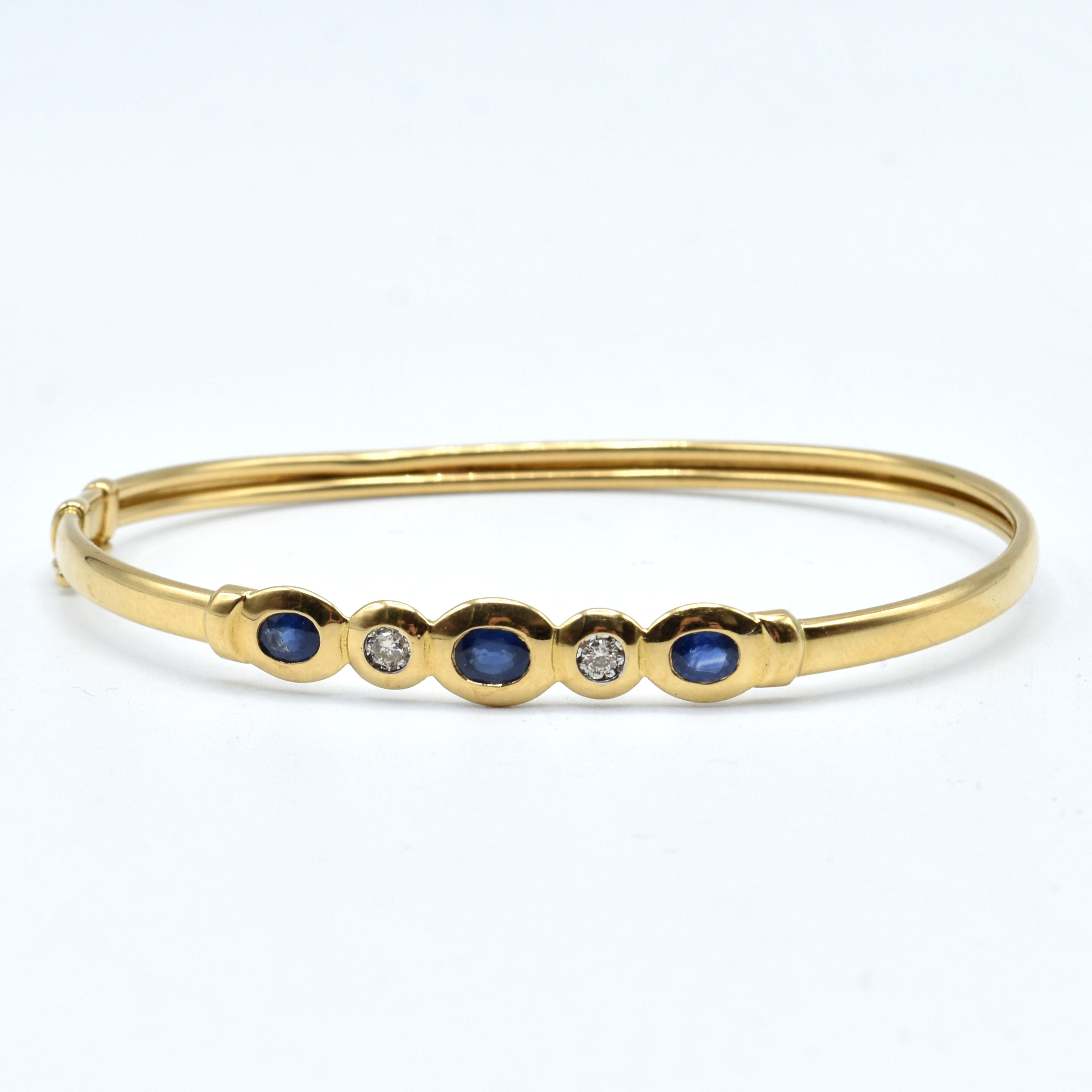 Onbuigzame armband in 18 kt geelgoud bezet met 2 briljanten +/- 0.20 kt en 3 saffieren - 7.5 g (Diam: 6 x 4.7 cm)