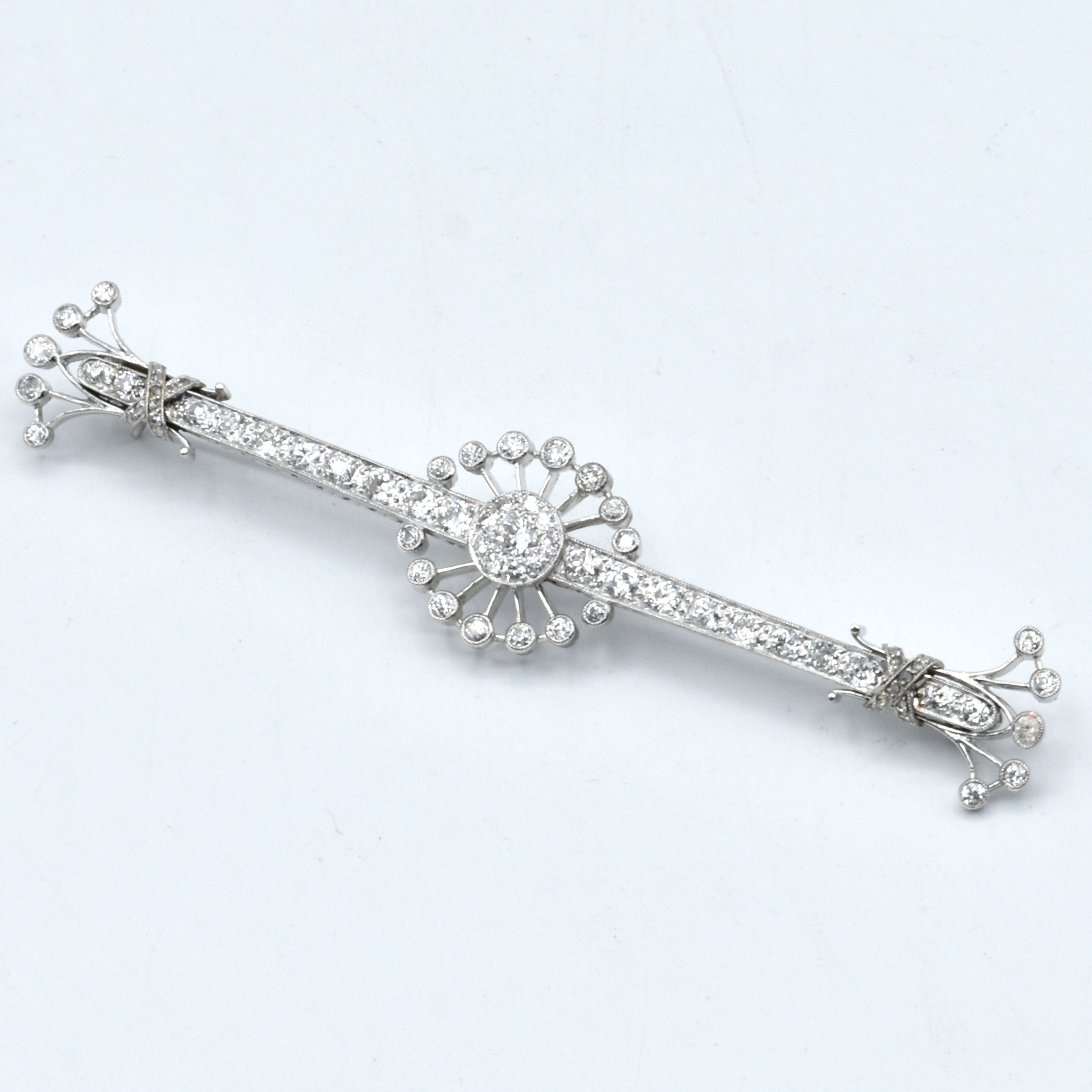 Borstspeld in platina met speld in 18 kt witgoud bezet met +/- 54 diamanten verschillende slijpsels +/- 2.15 kt en diamantroosjes (zeer licht gedeukt) - 12.4 g + originele doos (beschadigd)