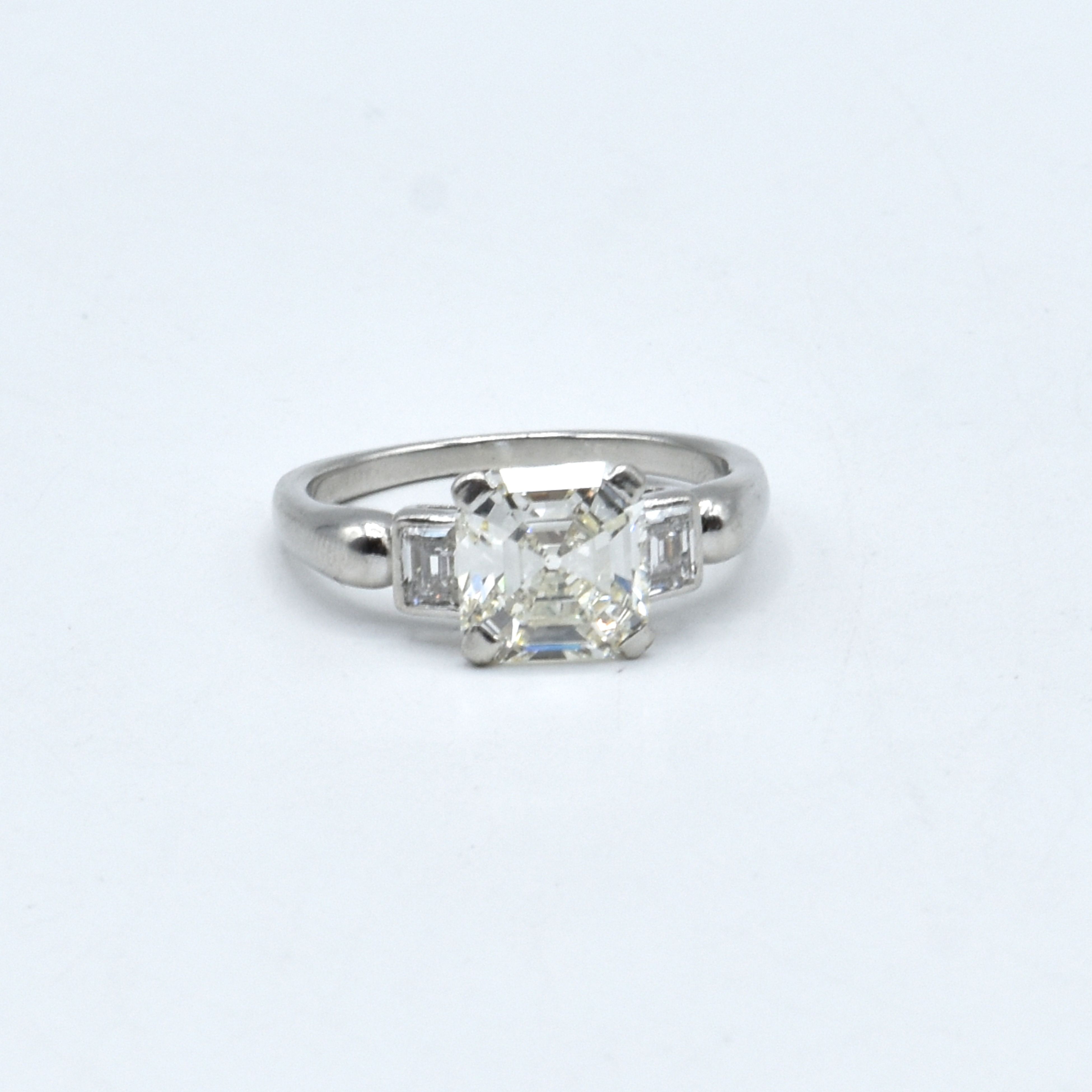Ring in platina bezet met 1 diamant smaragdslijpsel +/- 2.40 kt en 2 diamanten baguetteslijpsel 2 x +/- 0.20 kt - 6.1 g (Maat: 56.5)