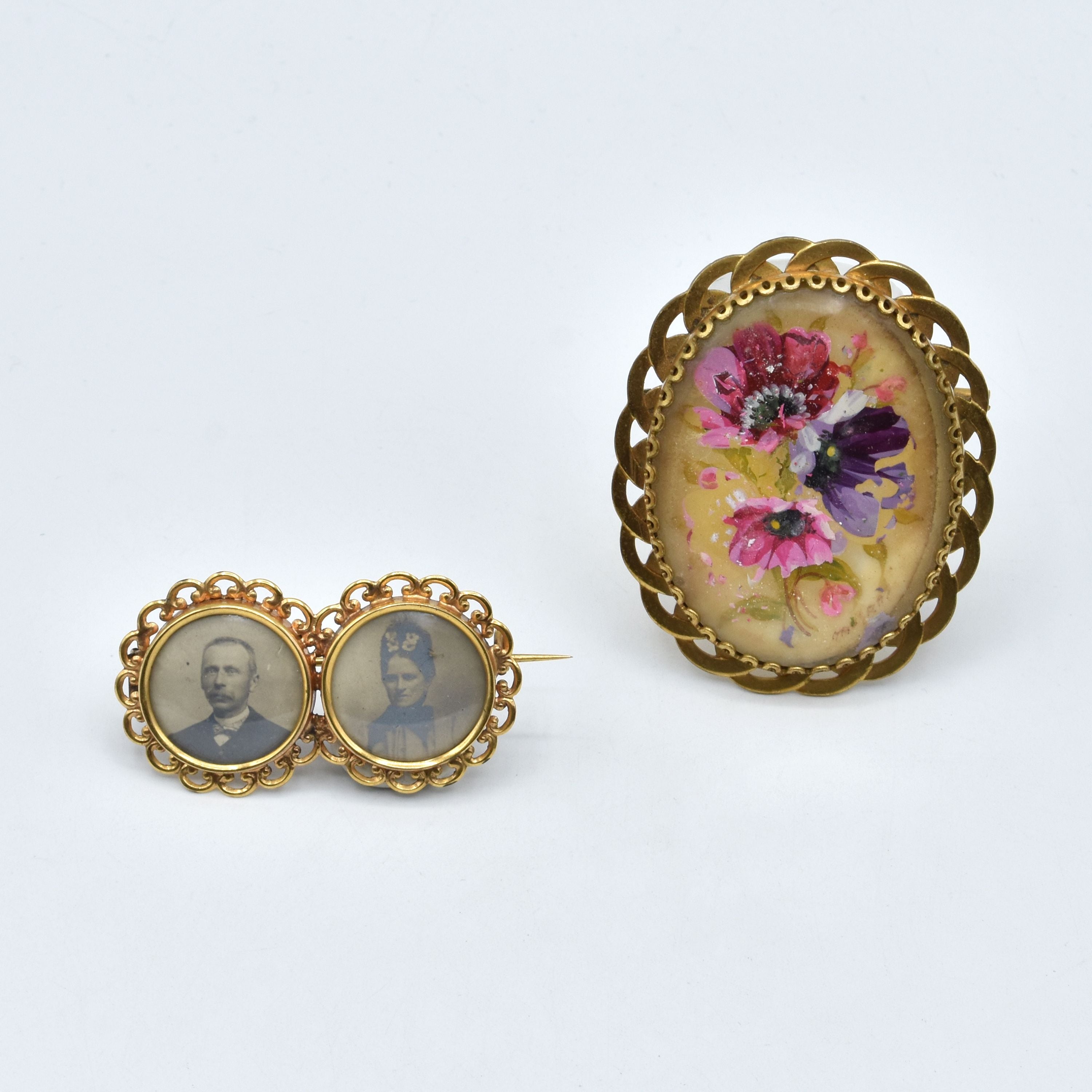 2 borstspelden in pleetgoud (foto, plexi met bloemmotief, plexi, deel van de sluiting ontbreekt, beschadigd, gedeukt)