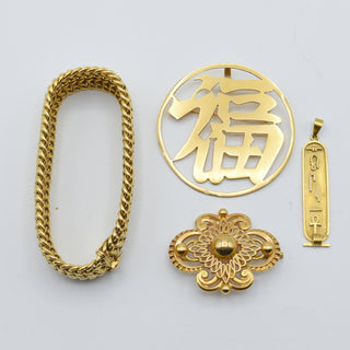 Hanger, armband en 2 borstspelden in 18 kt geelgoud (gedeukt) - 47.6 g