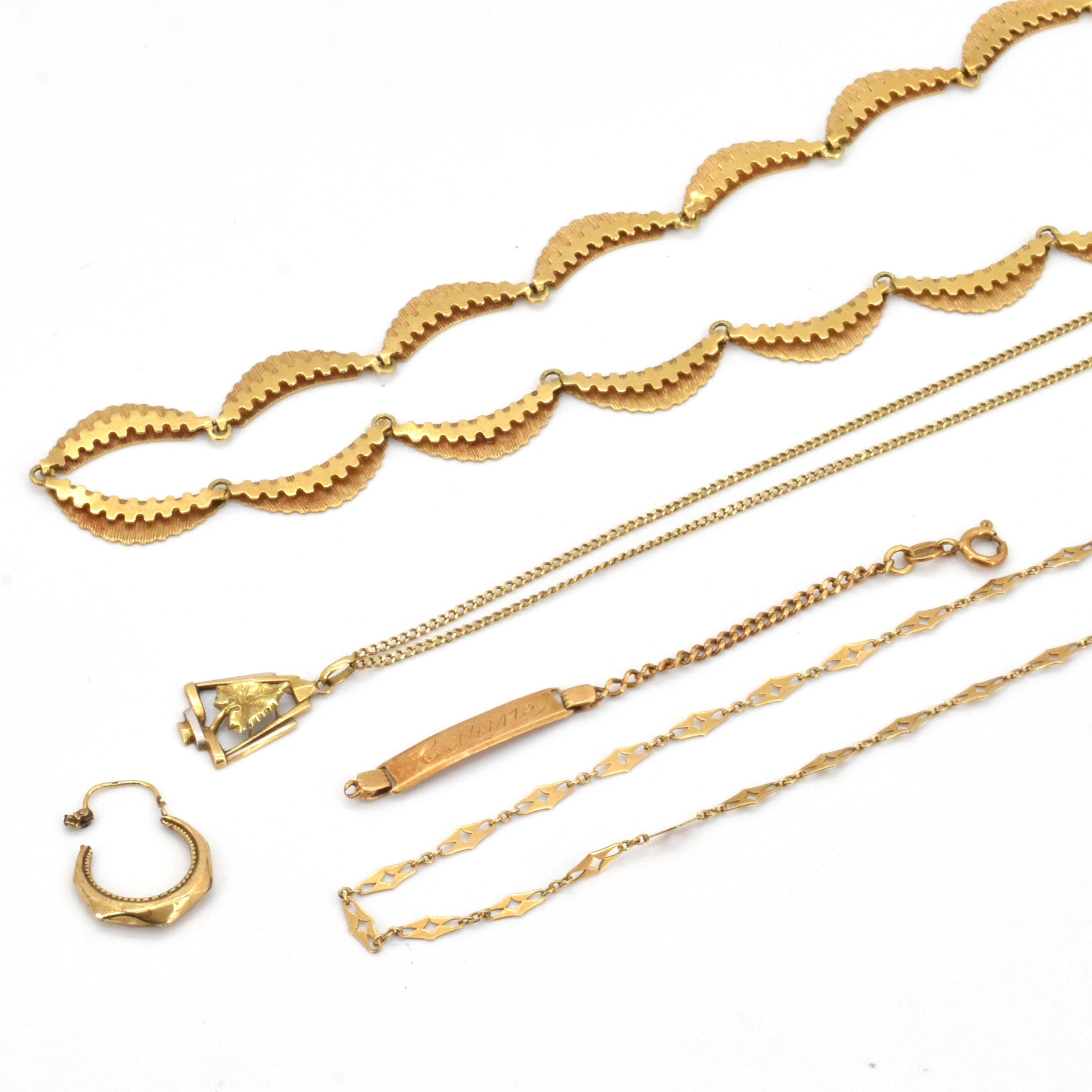 Ring in 9 kt geelgoud (gepersonaliseerd, gedeukt) - 3.6 g bruto (Maat: 61) Halsketting in platina - 2.4 g (38 cm) Damesuurwerk in 18 kt geelgoud LUNESA mechanisch (armband in pleetgoud elastofixo, glas gekrast, ontregeld) - 18.3 g bruto Speld in 14 kt geelgoud bezet met 1 parel (sluiting in metaal, gedeukt) - 2.4 g bruto